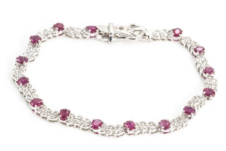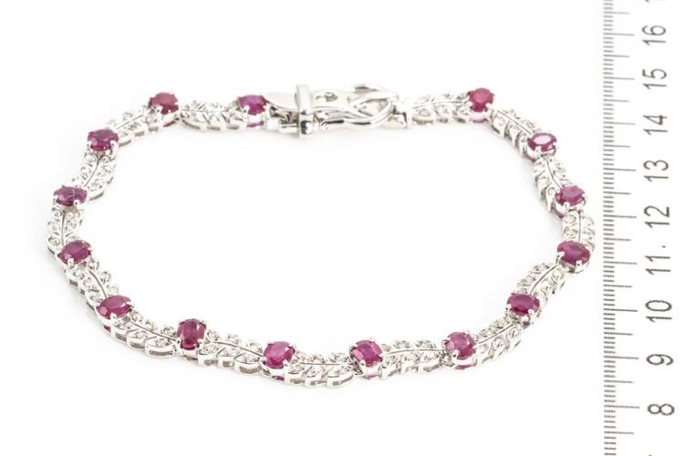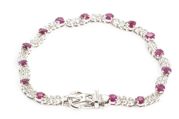 Ruby and Diamond bracelet with oval Rubies totalling 6.32cts and round Diamonds totalling 1.25cts (Estimated grading: K-L P1-P2). 18ct white gold with buckle design closure. Length: 22cm. Weight: 19.3g. With certificate #415856. (Pre-owned)