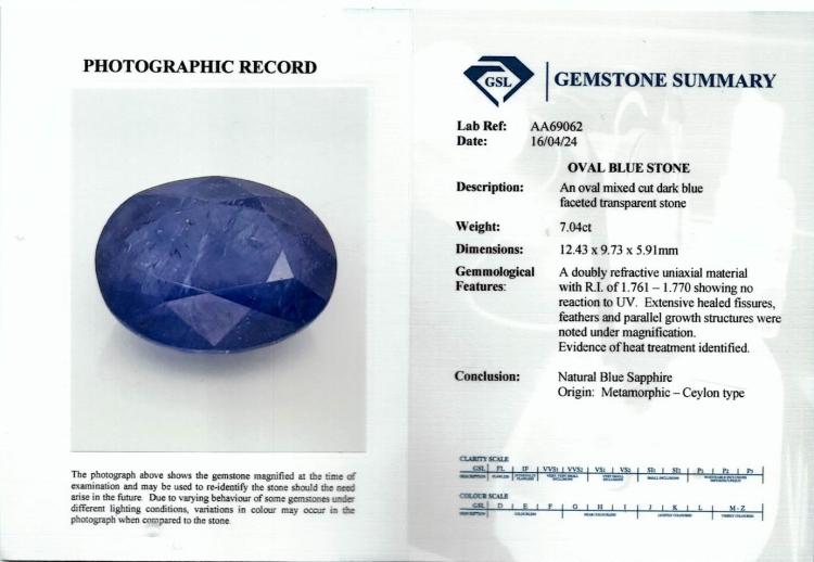 A loose oval shape Ceylon natural blue Sapphire of 7.04ct. With GSL Report #AA69062. (As New)