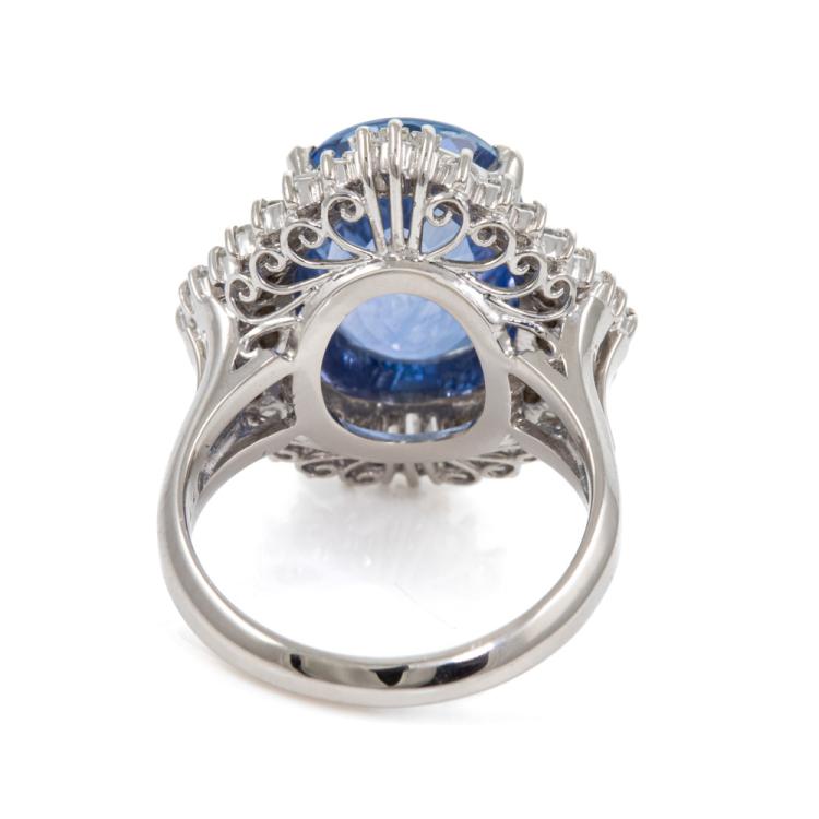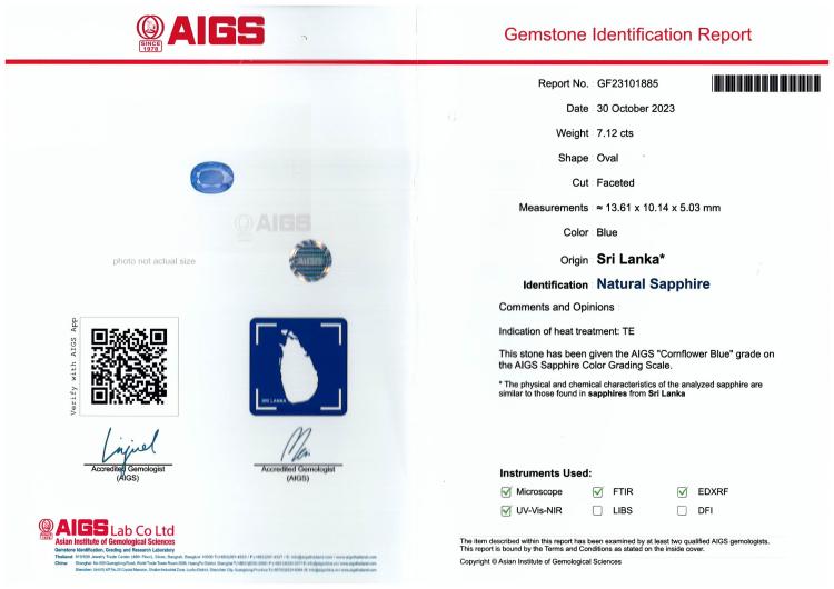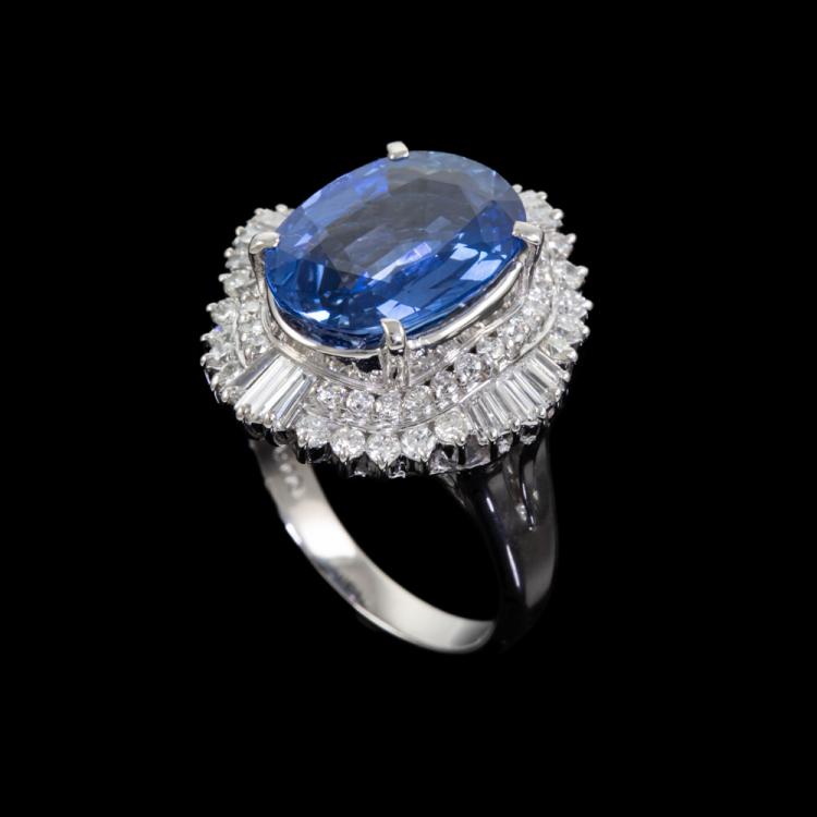 Sapphire and Diamond ring with oval shape Natural Sri Lankan cornflower blue Sapphire of 7.12ct and baguette cut & round Natural Diamonds totalling 1.15cts (Estimated grading: G-H SI). Platinum 900. Ring size L1/2. Band width: 2.7 - 4.8mm. Weight: 12.6g. With AIGS Report#GF23101885. (Pre-owned)