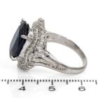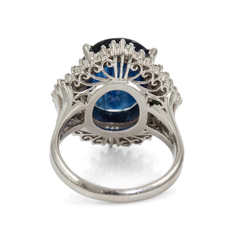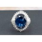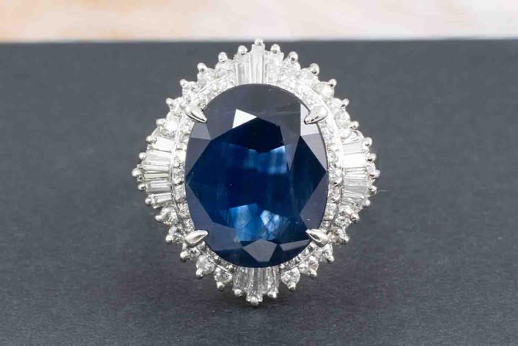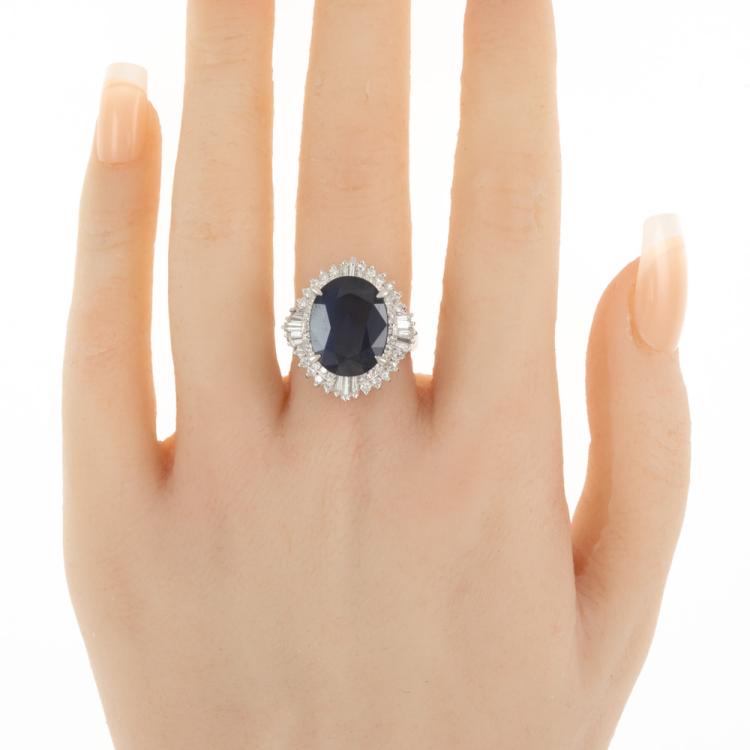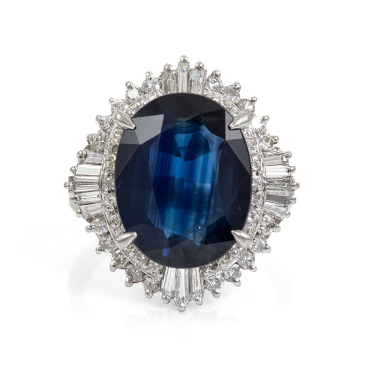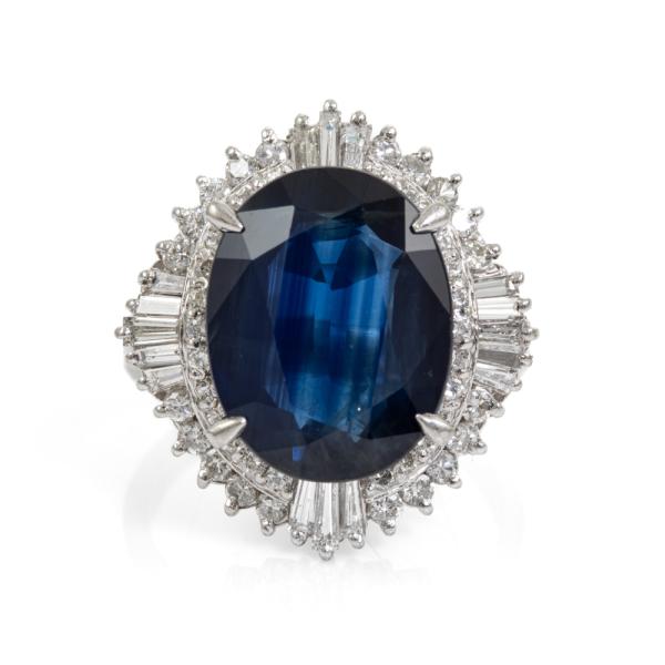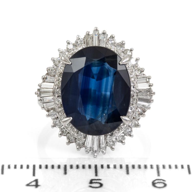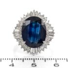 Sapphire and Diamond ring with oval shape natural blue Sapphire of 7.55ct and baguette & round natural Diamonds totalling 1.00ct (Estimated grading: G-H SI). Platinum 900. Ring size M 1/2. Band width: 2.5 - 5.8mm. Weight: 12.4g. With Certificate #418584. (Pre-owned)