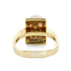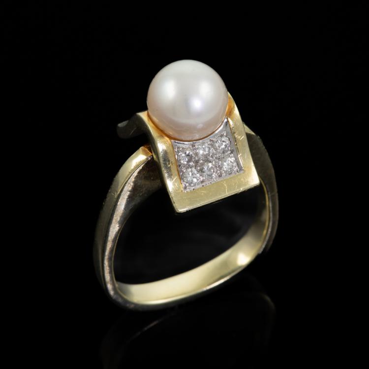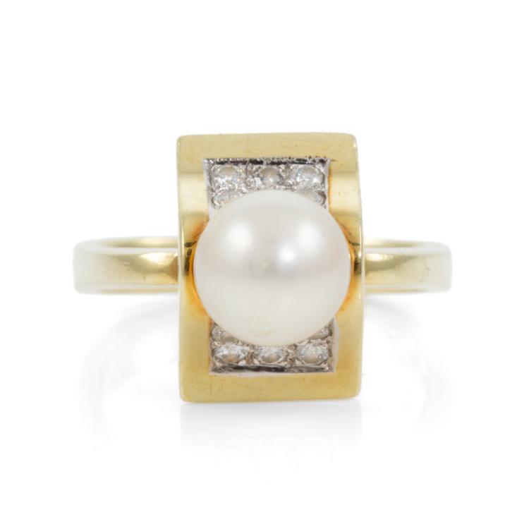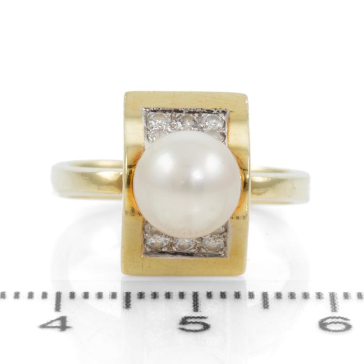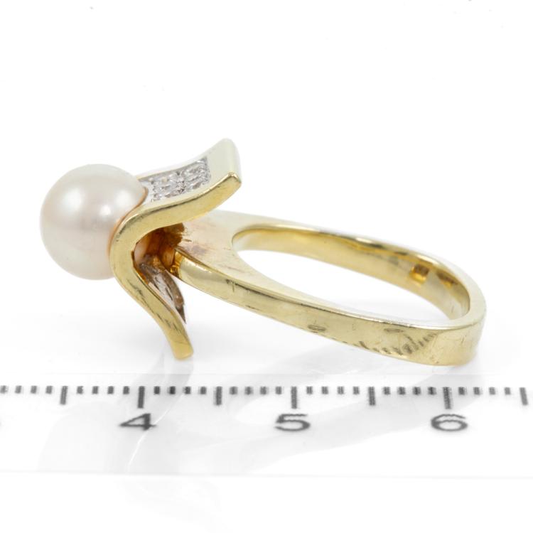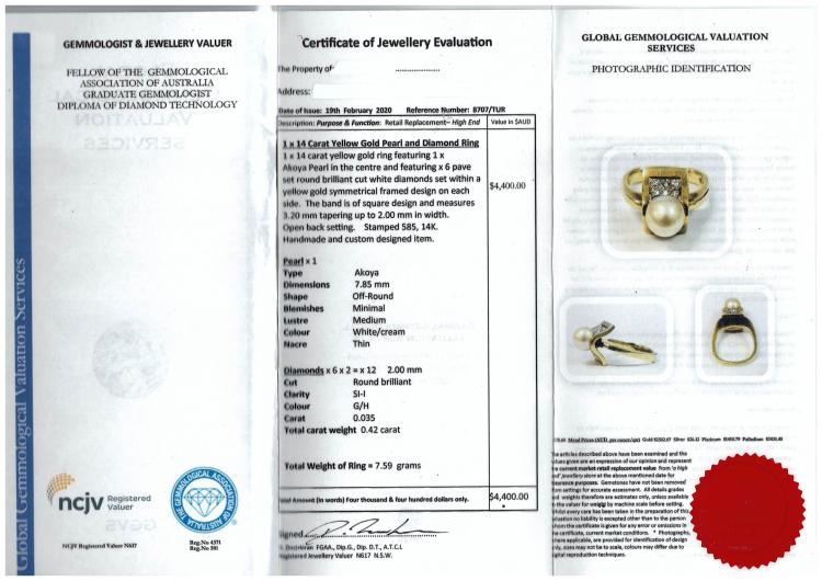 Pearl and Diamond ring with an Akoya pearl of 7.8mm and round Natural Diamonds totalling 0.42cts (Estimated grading: G-H SI1). 14ct yellow gold. Ring size M (note Euro shank). Band width: 3.1mm-2mm. Weight: 7.6g. With GGVS Valuation dated 19/02/20. (Pre-owned)