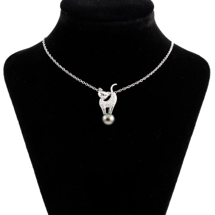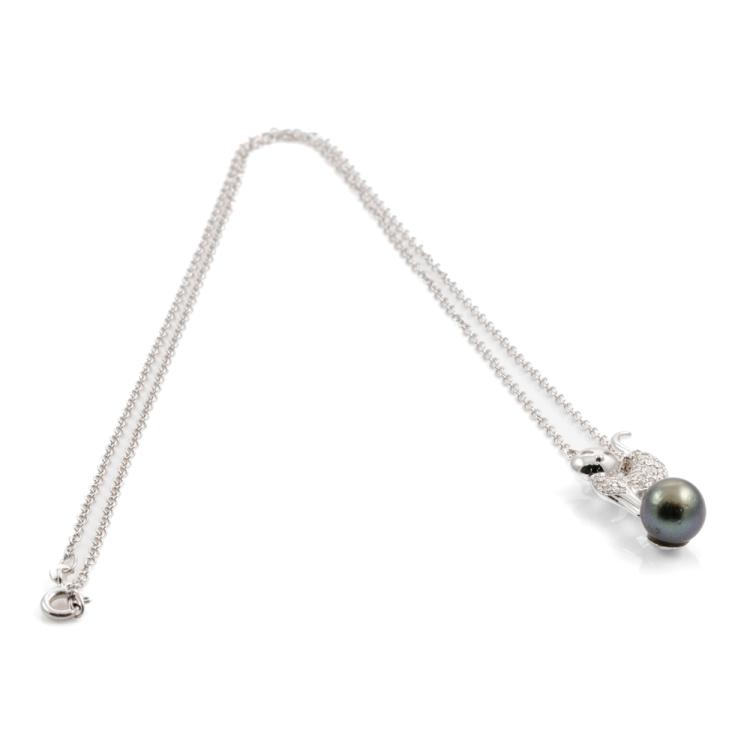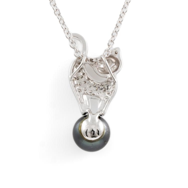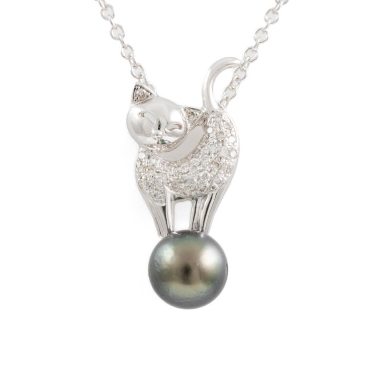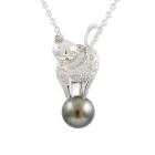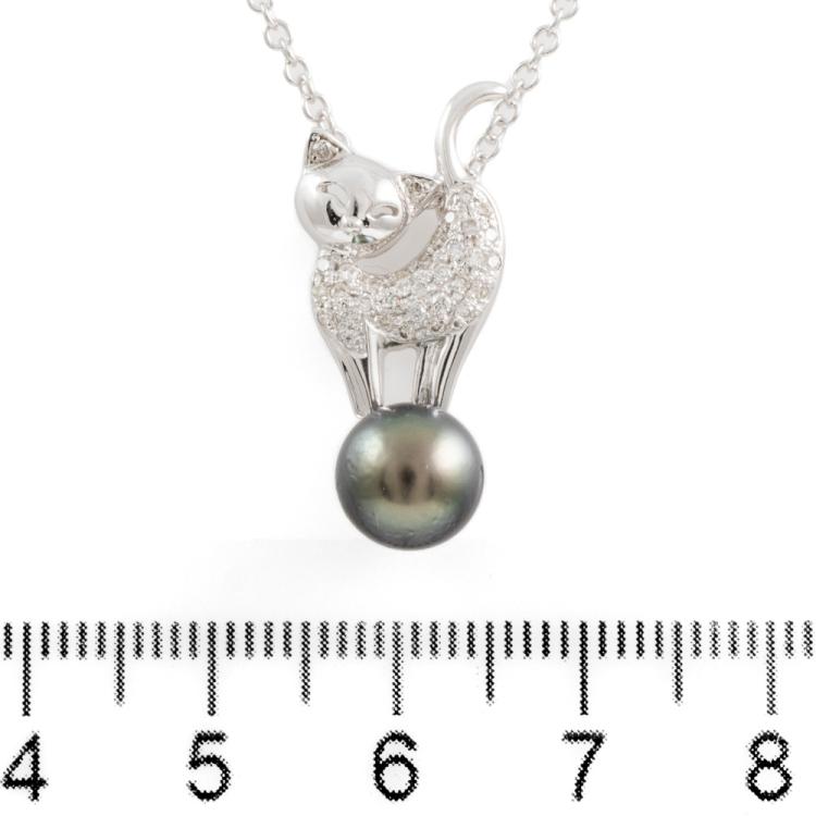 Pearl and Diamond cat design pendant with Tahitian Pearl of 7.8mm and Natural Diamonds totalling 0.18cts. 18ct white gold with 43.5cm 18ct white gold chain. Weight: 4.9g. (Pre-owned)