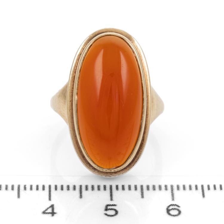 Carnelian ring with oval cabochon cut Natural Carnelian of approximately 8.20ct. 9ct yellow gold. Ring size K1/2. Band width: 1.8mm - 2.6mm. Weight: 6.8g. (Pre-owned)