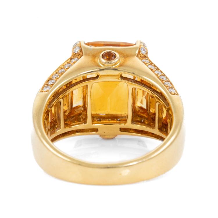 Citrine and Diamond ring with round & fancy cut natural Citrine totalling 9.28ct (note small chip on 1 stone) and round natural Diamonds totalling 0.38cts (Estimated grading: H SI). 18ct yellow gold. Ring size M. Band width: 3.2mm-7.6mm. Weight: 10.6g. (Pre-owned)