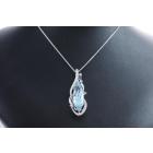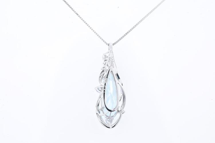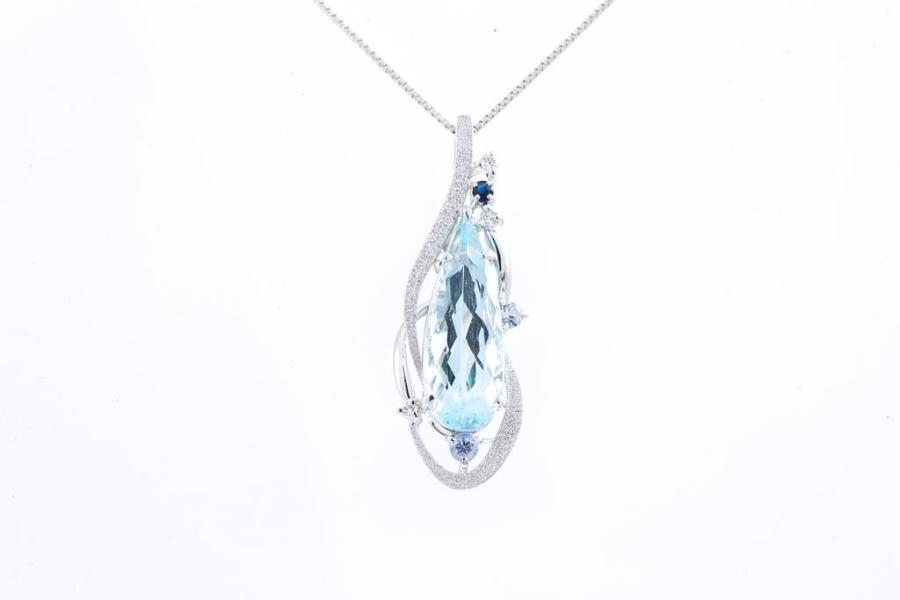 Pendant with a pear shape Natural Aquamarine of 4.21ct and 3 blue round Natural Sapphires totalling 0.17cts and round Natural Diamonds totalling 0.05cts. 18ct white gold with 18ct white gold adjustable 44cm chain. Weight: 5.5g. (Pre-owned)