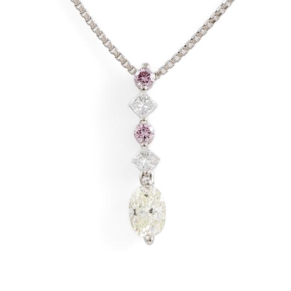 Diamond pendant with 2 round pink Natural Argyle origin Diamonds totalling 0.115cts (one Diamond of 0.057ct with GSL Report graded as Fancy Intense Pink P1 #AA68943/3. Origin: Argyle Deposit Western Australia) and oval Natural Diamond of 0.70ct (Estimated grading: L VS) and 2 princess cut Natural Diamonds totalling 0.16cts. Platinum 900 with Platinum 850 adjustable 45.0cm chain. Weight: 5.8g. (Pre-owned)