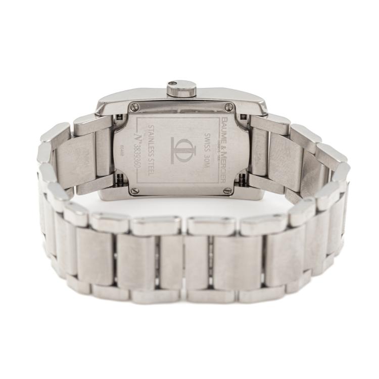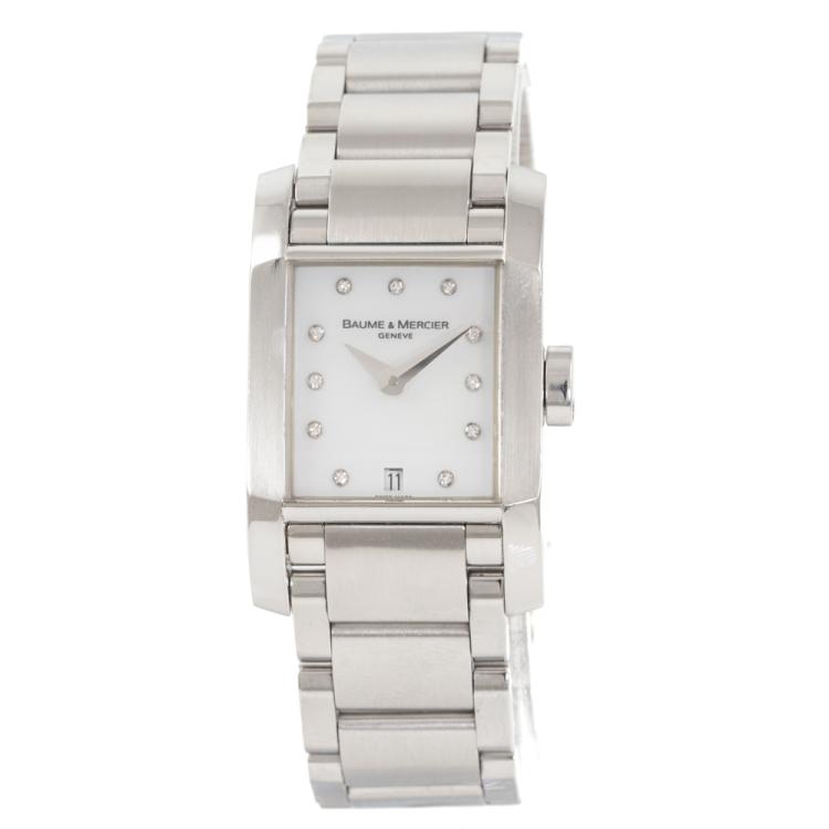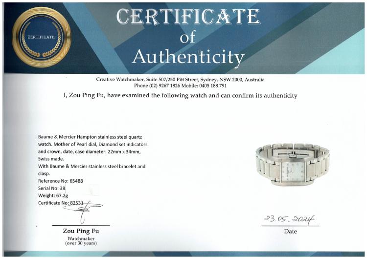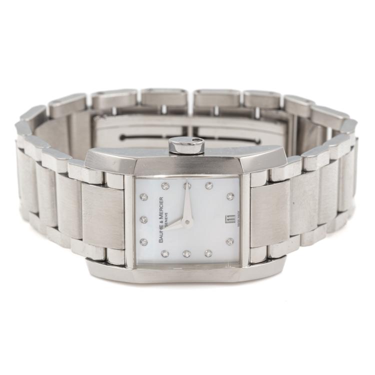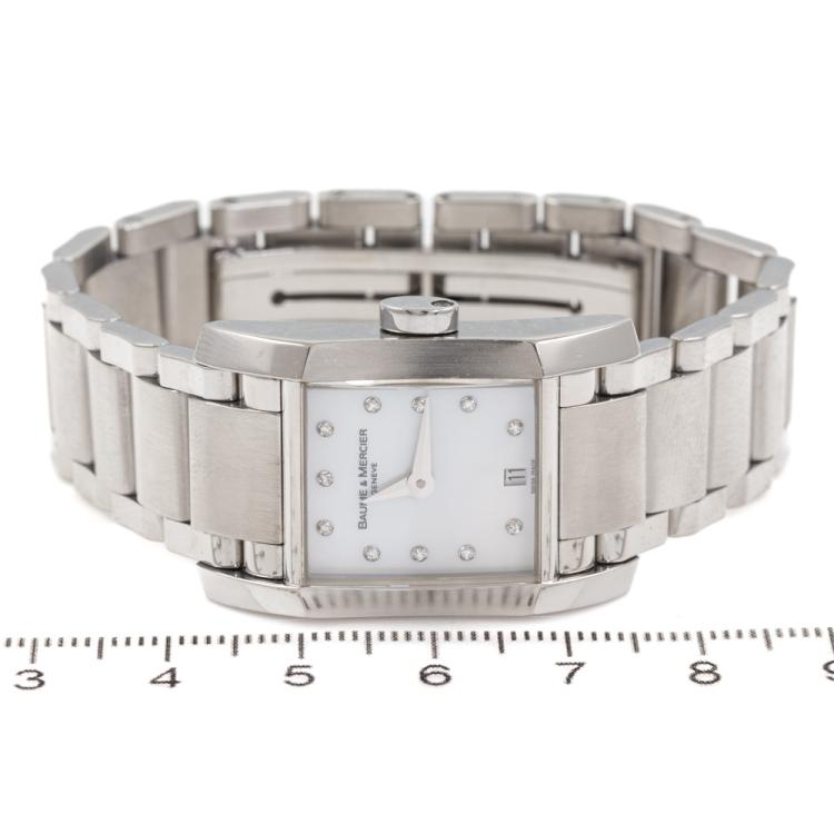 Baume & Mercier Hampton stainless steel quartz watch. Mother of Pearl dial, Diamond set indicators and crown, date, case diameter: 22mm x 34mm, wrist size: 16cm, Swiss Made. Ref# 65488. With Baume & Mercier stainless steel bracelet and clasp. With Certificate of Authenticity. 3 Month FSA warranty. (Pre-owned)