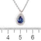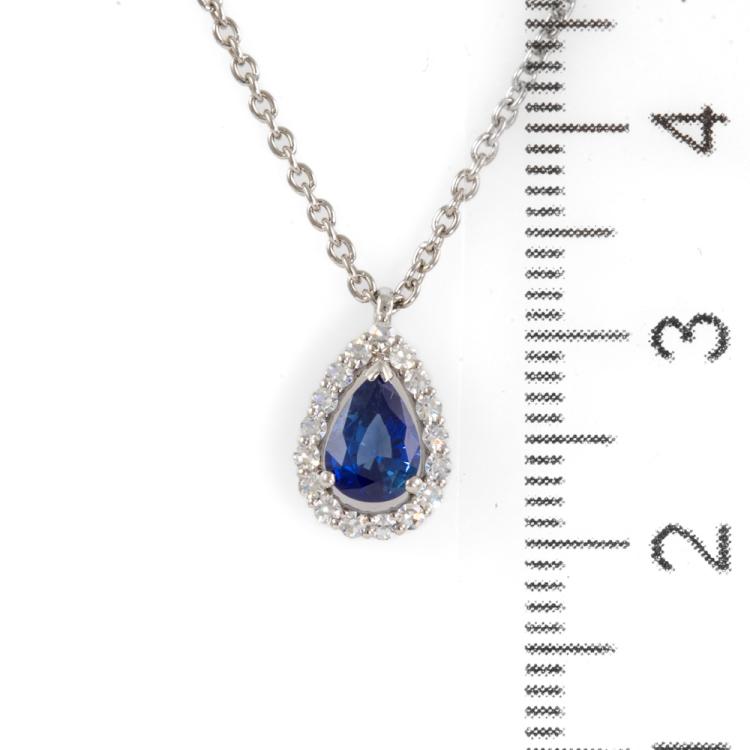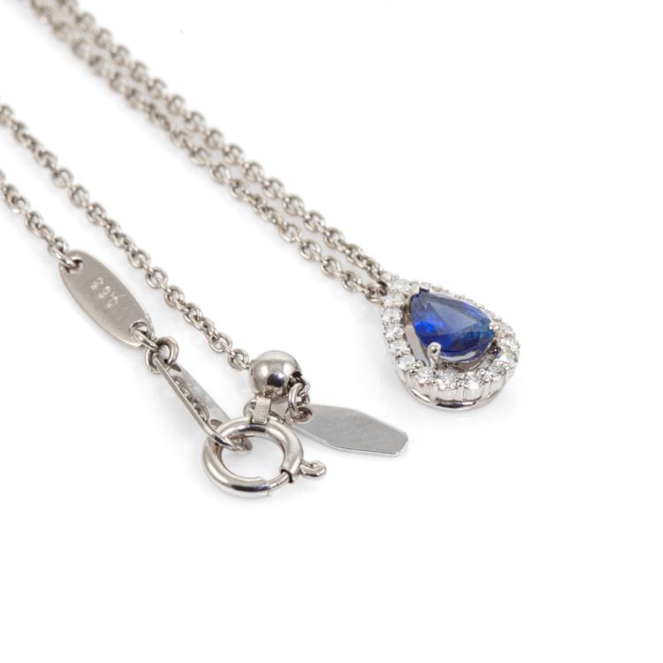 Sapphire and Diamond pendant with pear shape blue Natural Sapphire of 0.53ct and round Natural Diamonds totalling approximately 0.15cts. Platinum 900 with 50.0cm Platinum 900 Adjustable chain. Weigh: 5.3g. (Pre-owned)
