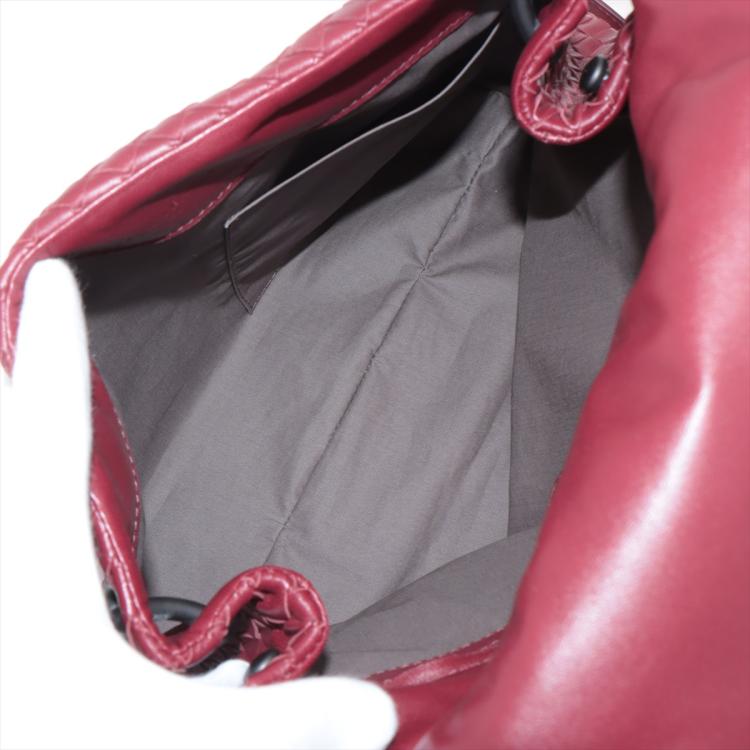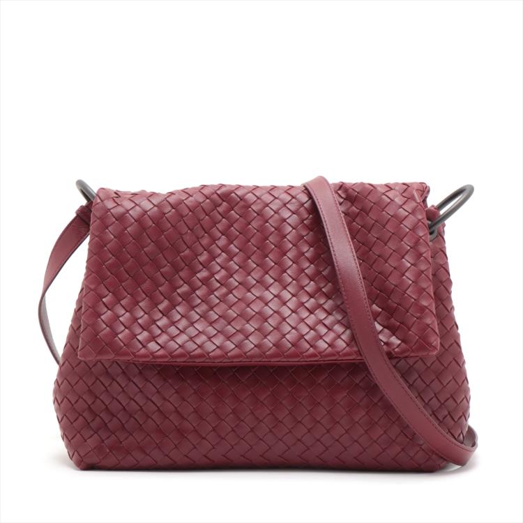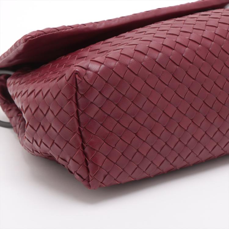 Bottega Veneta shoulder bag in Intrecciato leather in bordeaux colour. Featuring metal tone hardware, flip-over flap with magnetic closure at front. The flap opens to a grey fabric lining interior with zipped and patch pocket. Approximate dimensions: 28cm(L) x 23cm(H) x 11cm(D) and 61cm adjustable shoulder strap height. With Entrupy Certificate of Authenticity. (Pre-owned)