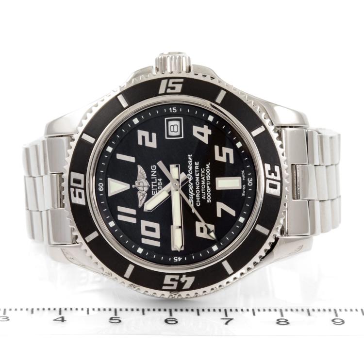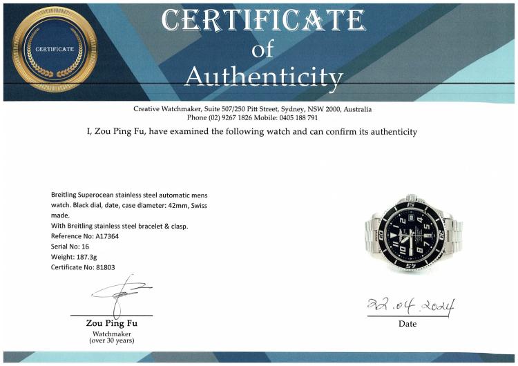Breitling Superocean stainless steel automatic mens watch. Black dial, date, case diameter: 42mm, wrist size: 16.5cm, Swiss made. Ref #A17364. With Breitling stainless steel bracelet & clasp. With Certificate of Authenticity, Undated Breitling international warranty booklet and Breitling box. 3 month warranty. (Pre-owned)