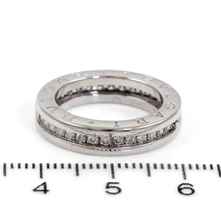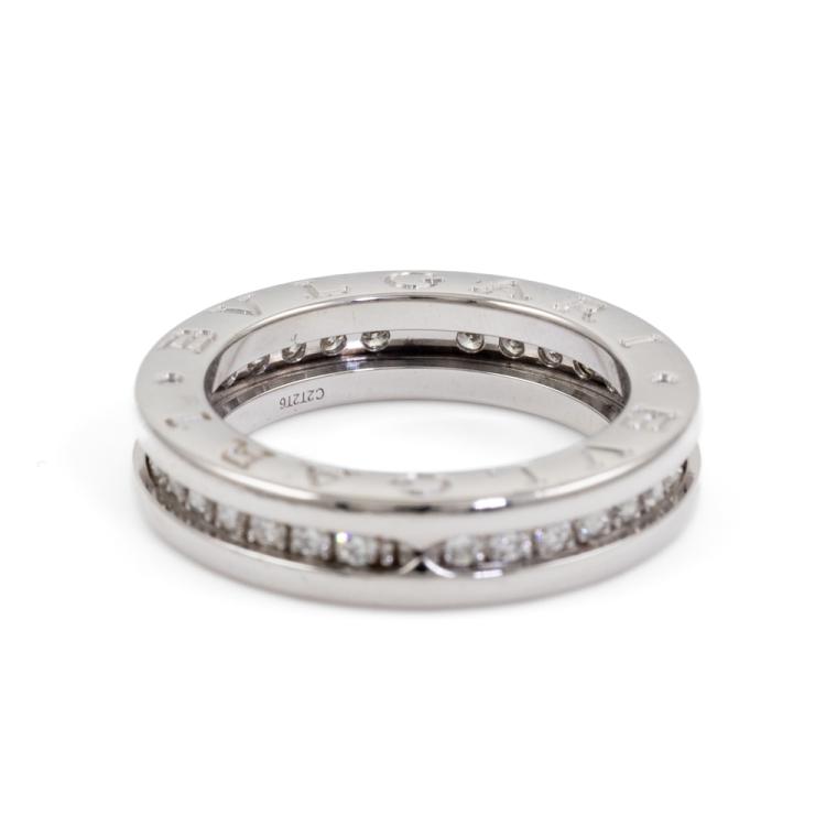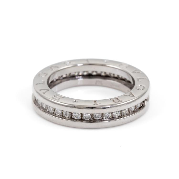 Bvlgari B.Zero1 one band ring with pave round natural Diamonds totalling 0.45ct (Estimated grading: F VS). 18ct white gold. Bvlgari stamped size 49, actual size I 1/2 - ring resizing is not recommend. Band width: 4.7mm. Made in Italy. Weight: 6.6g. With Bvlgari box. (Pre-owned)