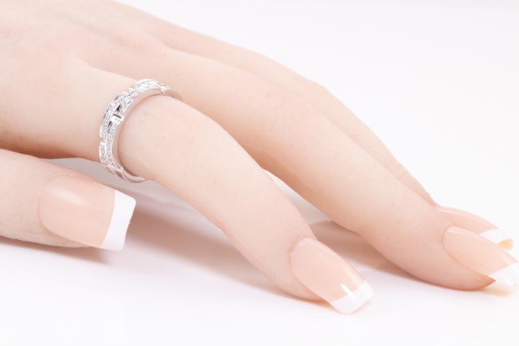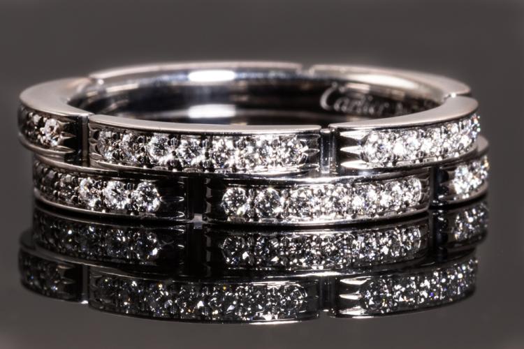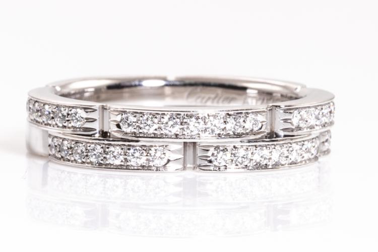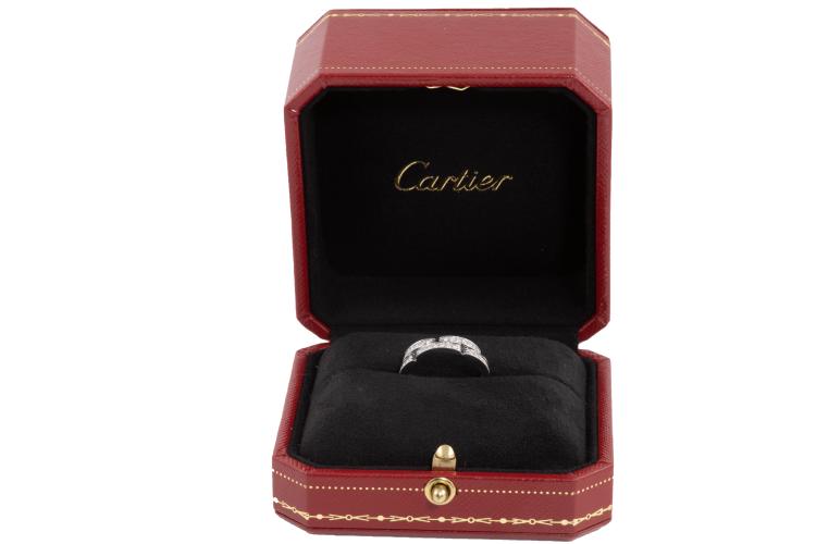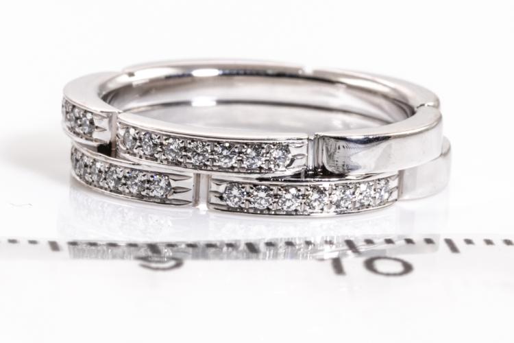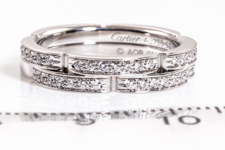 Cartier Maillon Panthere band with two half paved rows of 42 Diamonds totalling 0.30ct (Estimated grading: F VS). 18ct white gold. Cartier stamped size 51, L - ring resizing is not recommended. Width: 4.2 mm. Weight: 6.1g. With Cartier Certificate dated 07/12/2014 and Cartier box. (Pre-owned)