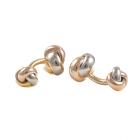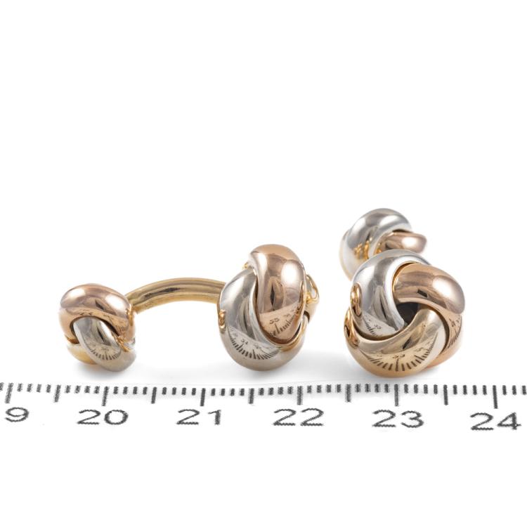 Cartier Trinity Cufflinks. 18ct yellow, white, and rose gold. The large knot measures 13.2mm in diameter and the smaller knot measures 10.2mm with a bar connecting the two. The cufflinks measure 27.0mm in length. Weight: 19.4g. With certificate #418389. (Pre-owned)
