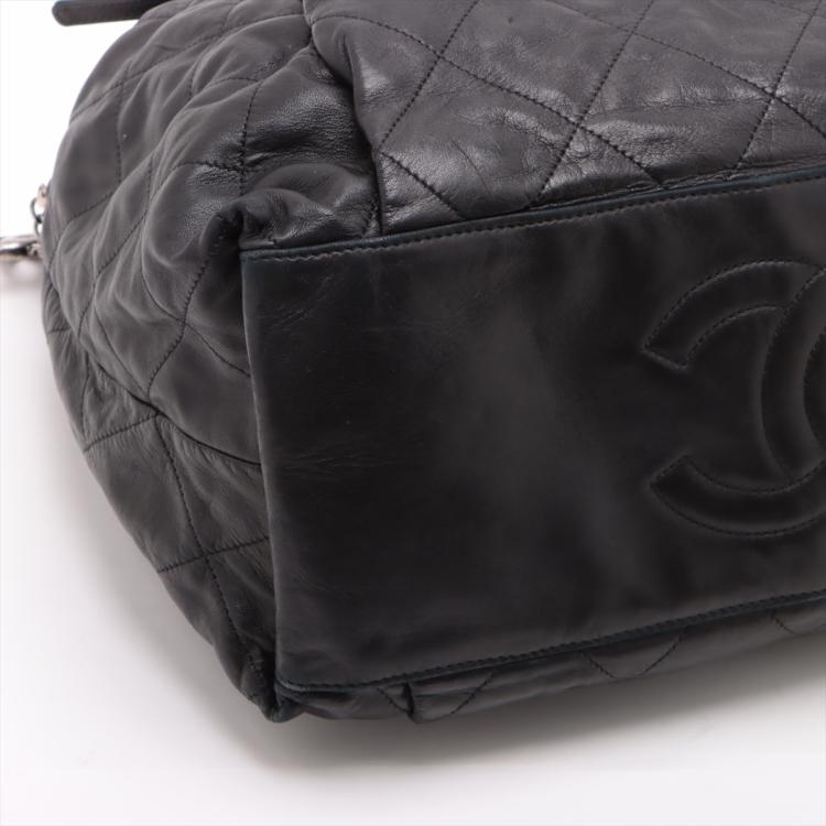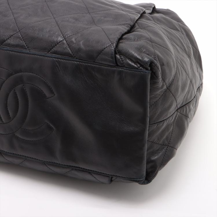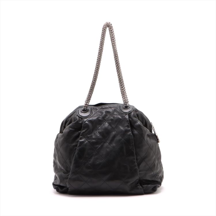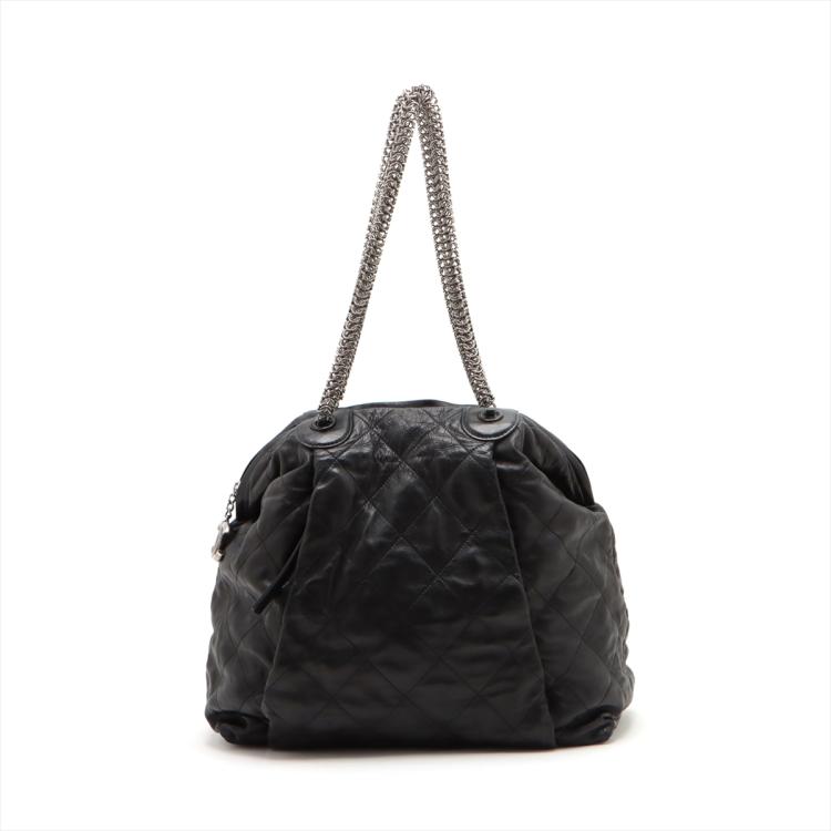 Chanel chain shoulder bag in black, diamond quilted soft lambskin. Featuring silver tone hardware, chain-link shoulder straps, exterior zipped pockets at front and rear, CC logo stitched at the bottom. Top zip closure opens to a black satin lining interior with patch and zipped pockets. Approximate dimensions: 36cm(L) x 33cm(H) x 16.5cm(D), 27cm shoulder height. With Entrupy Certificate of Authenticity. (Pre-owned)