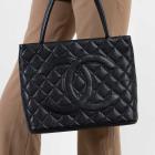 Chanel vintage Medallion tote bag in black diamond quilted Caviar leather. Featuring gold-toned hardware, an exterior patch pocket to the back, dual leather handles, top zipper closure with a Chanel logo plate. This opens to a black leather lining interior with zipper and patch pockets. Approximate dimensions: 30cm(L) x 24cm(H) x 15cm(D), 15cm handle drop. With Entrupy Certificate of Authenticity. (Pre-owned)