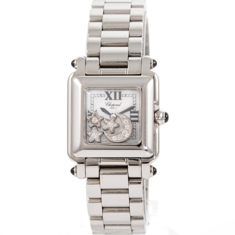 Chopard Happy Sport Square stainless steel quartz ladies watch. Mother of Pearl dial with Diamond set floating stars & moon, case diameter: 23mm, wrist size: 16.5cm, Swiss made. Ref# 27/8893-23. With Chopard stainless steel bracelet and clasp. With Certificate of Authenticity, Chopard Certificate of Origin dated 04/09/2005 and Chopard box. 3 month FSA warranty (Pre-owned)