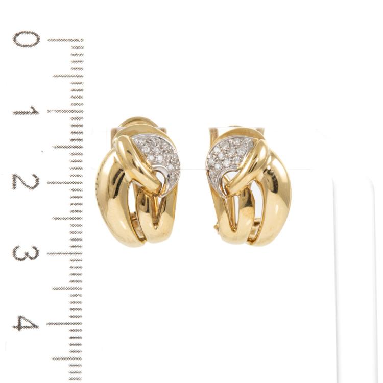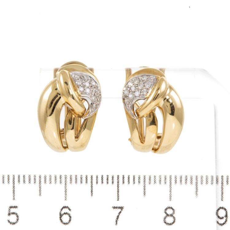 Diamond clip-on earrings (for pierced ears) with round natural Diamonds totalling approx. 0.17cts. 18ct yellow gold and white gold. Weight: 8.6g. (Pre-owned)