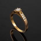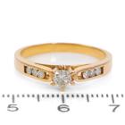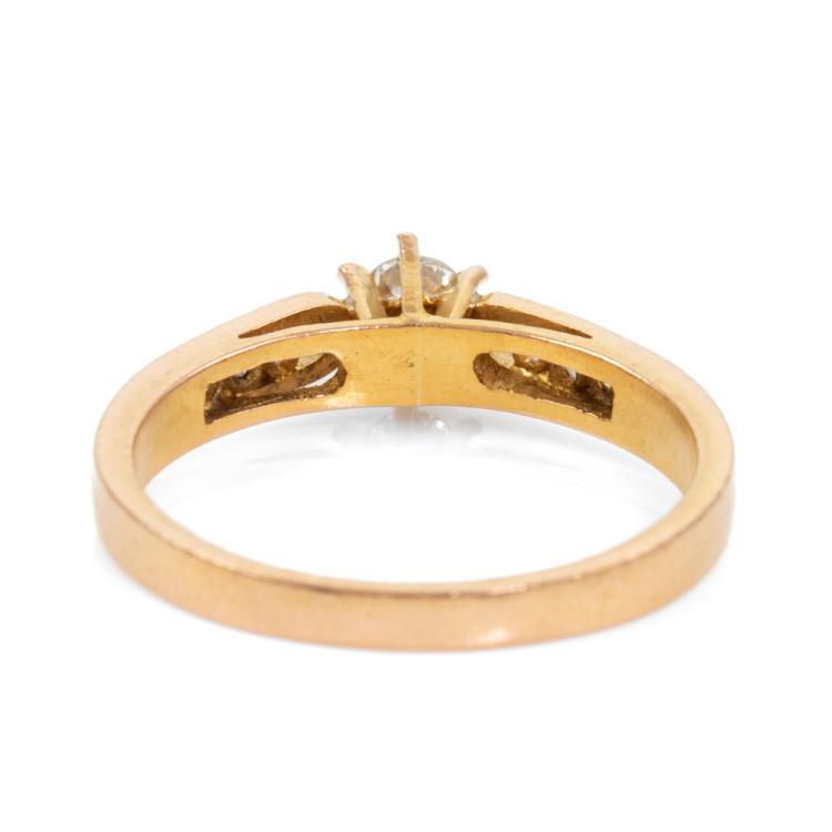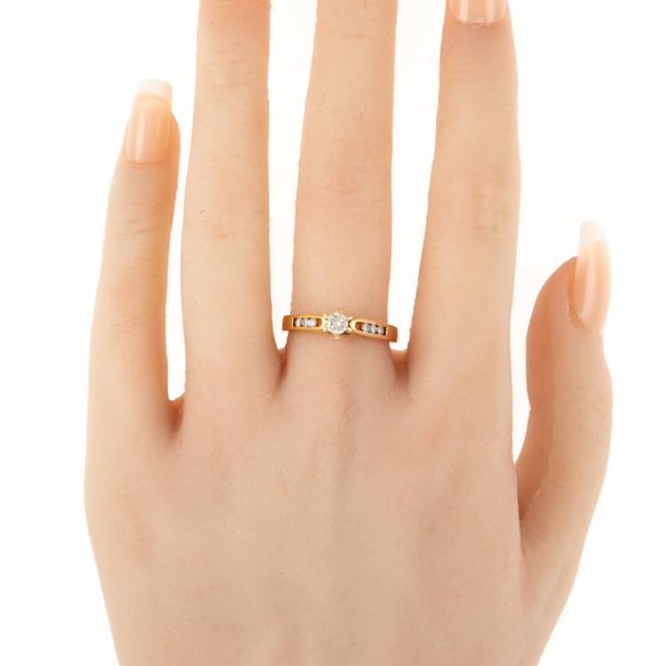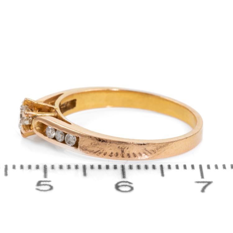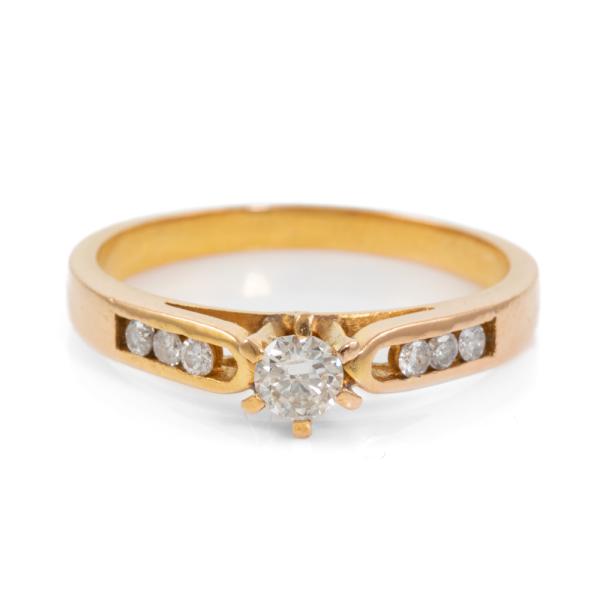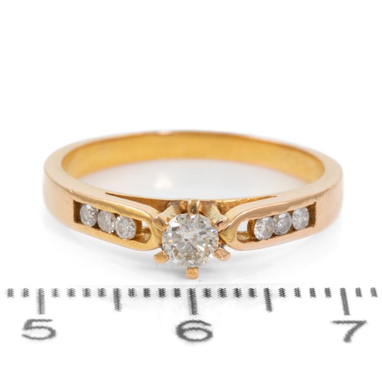 Diamond ring with centre round brilliant cut natural Diamond of 0.19ct and 6 round natural Diamonds totalling 0.12ct. Ring size P. Band width: 2.1mm - 3.0mm. 21ct yellow gold - XRF tested with no stamp. Weight: 3.8g. (Pre-owned)