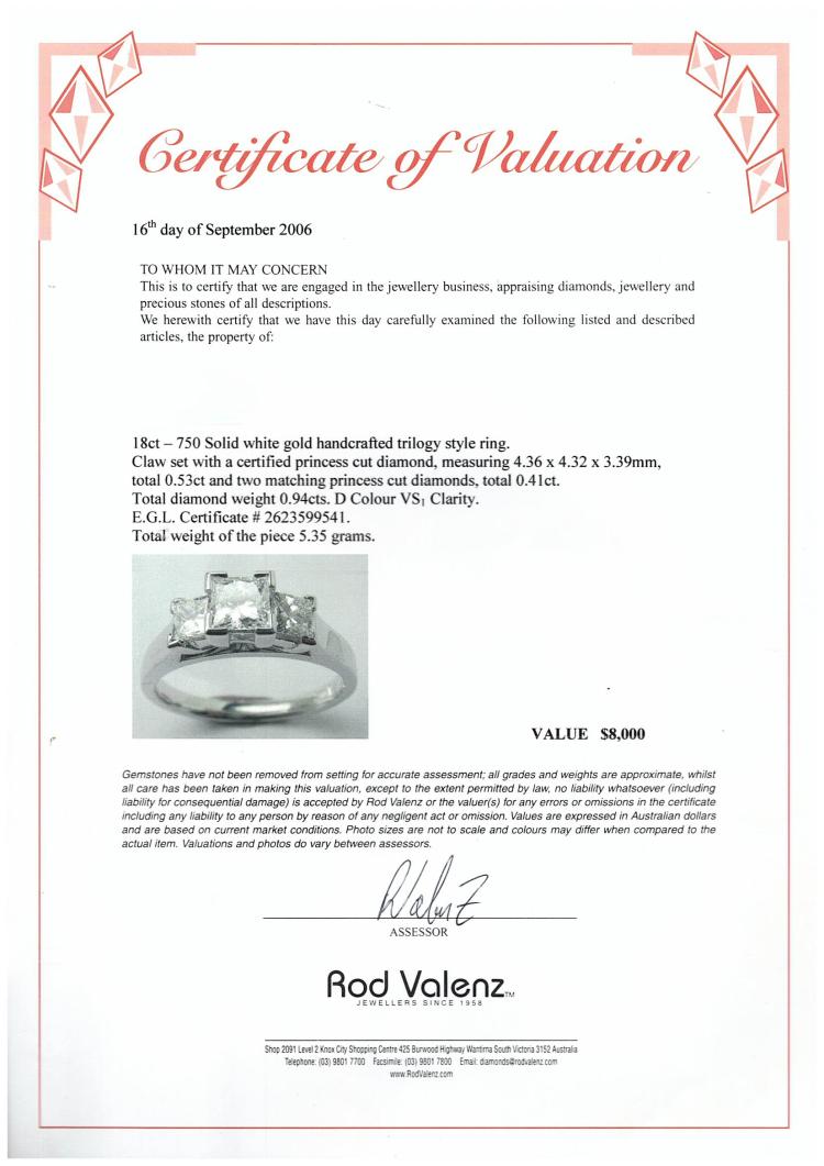 Diamond trilogy ring with a centre princess cut Natural Diamond of 0.53ct (with EGL memo graded as D VS1 #2623599541) and 2 shoulder princess cut Natural Diamonds totalling 0.41cts. 18ct white gold. Ring size G. Band width: 1.6mm-2.9mm. Weight: 3.8g. With Valuation Certificate dated 16/09/2006 (note discrepancy of current ring weight compared to the certificate weight, likely due to resizing down and polishing). (Pre-owned)