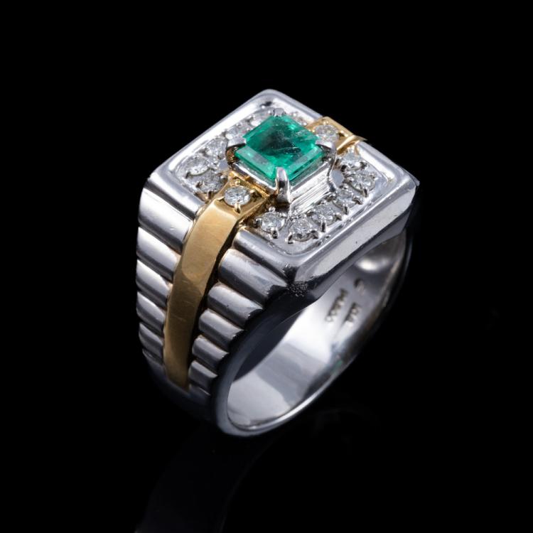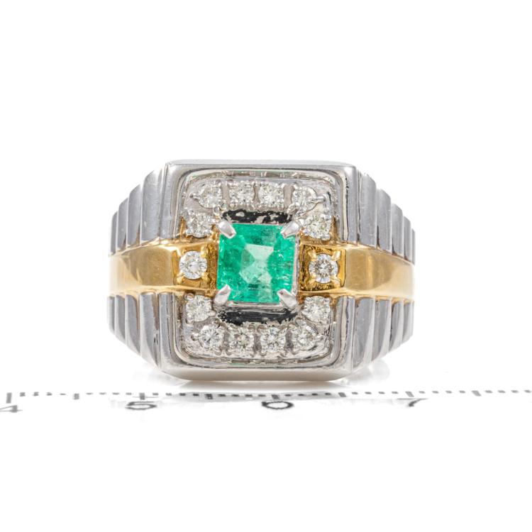 Emerald and Diamond ring with square emerald cut Natural Emerald of 0.86ct and round Natural Diamonds totalling 0.49ct (Estimated grading: H-I SI). Platinum 900 and 18ct yellow gold. Ring size U. Band width: 5.9mm - 10.3mm. Weight: 23.0g. (Pre-owned)