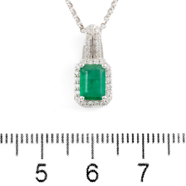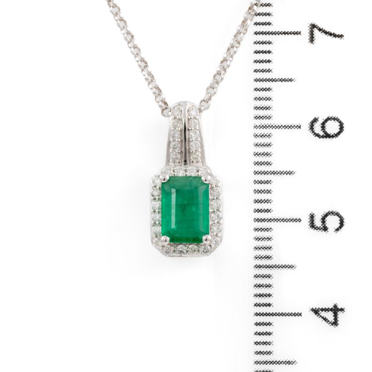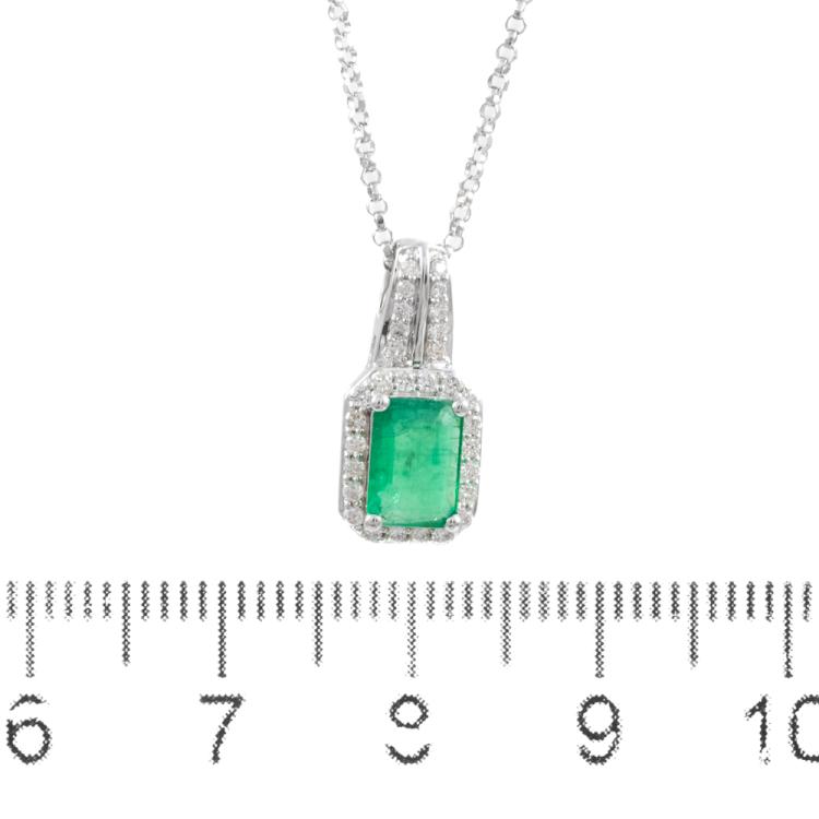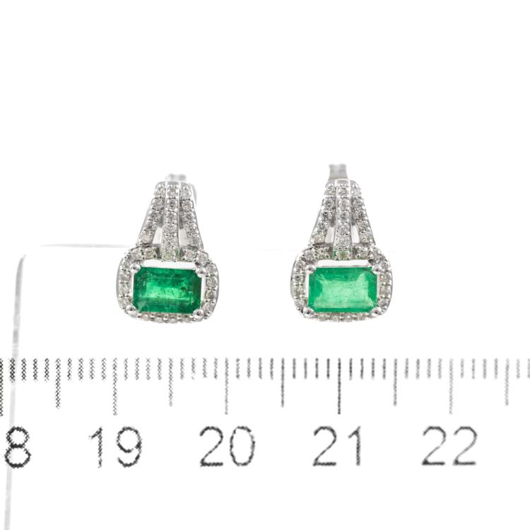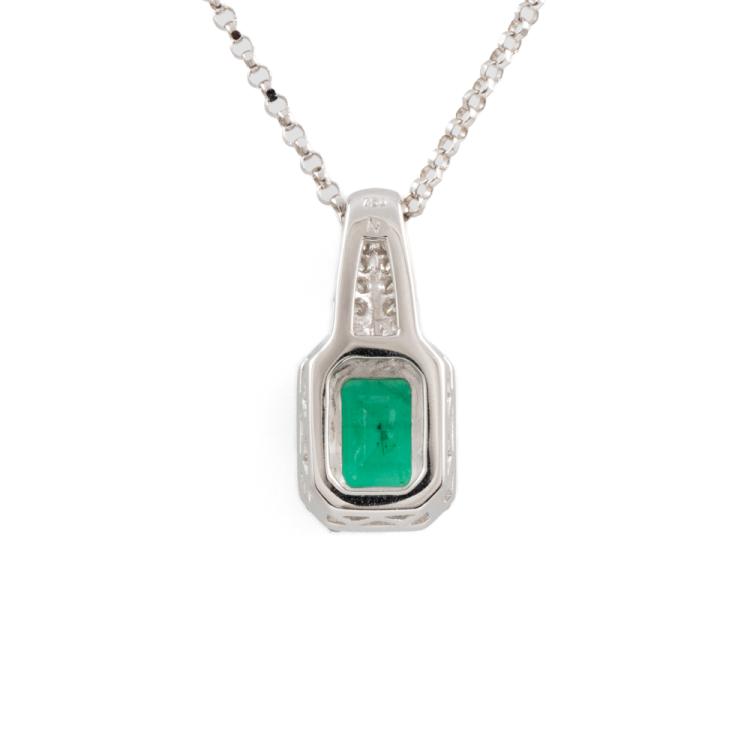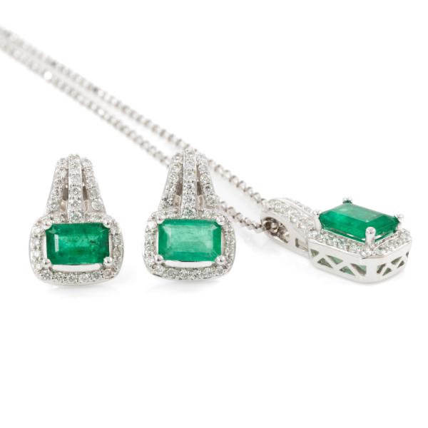 Pendant and earrings set. Emerald pendant with emerald cut natural Emeralds of 0.73ct and round natural Diamonds totalling 0.18cts, 18ct white gold with 45cm 18ct white gold chain. Emerald earrings with 2 emerald cut natural Emerald totalling 1.04cts and round natural Diamonds totalling 0.29cts, 18ct white gold. Total weight: 6.3g. With Valuation dated 28/10/13. (Pre-owned)