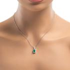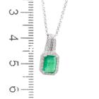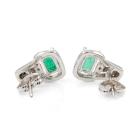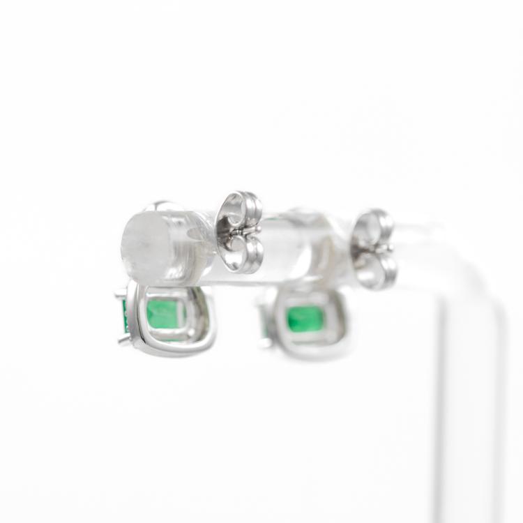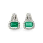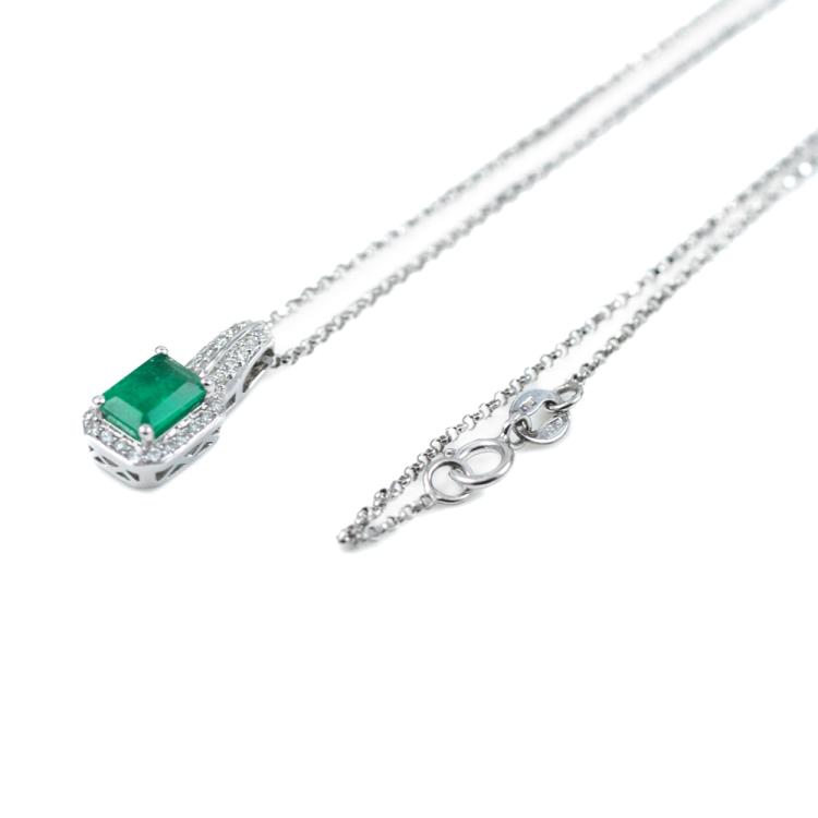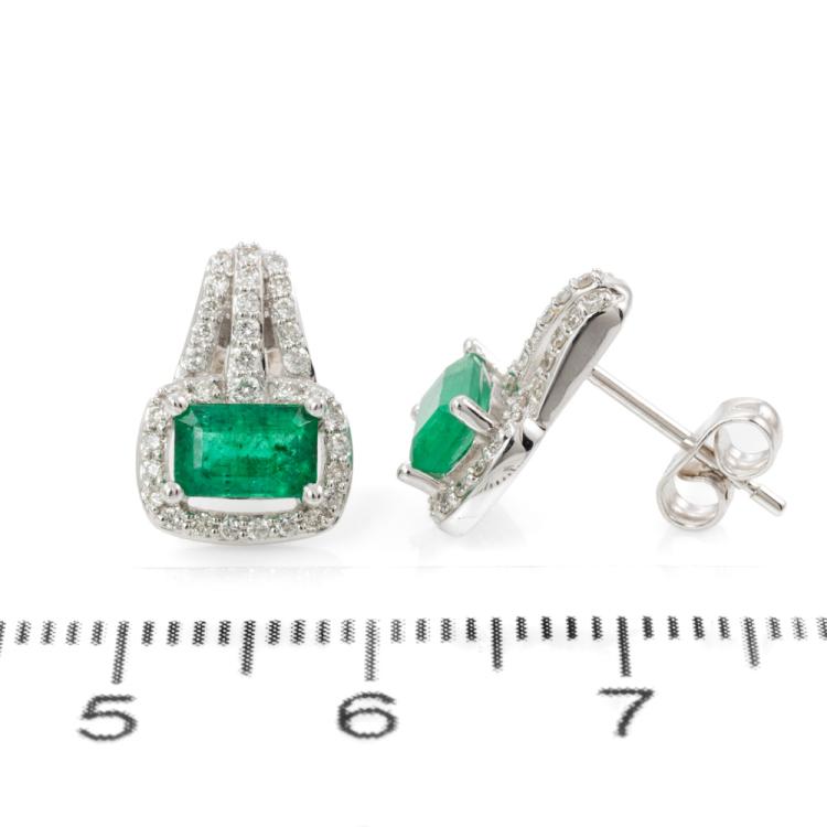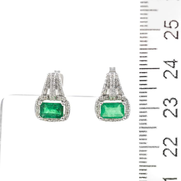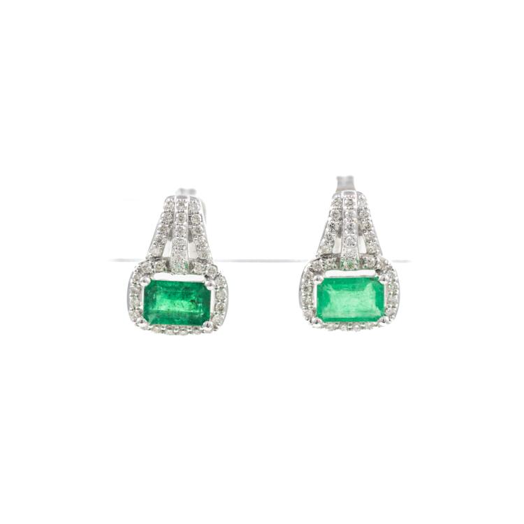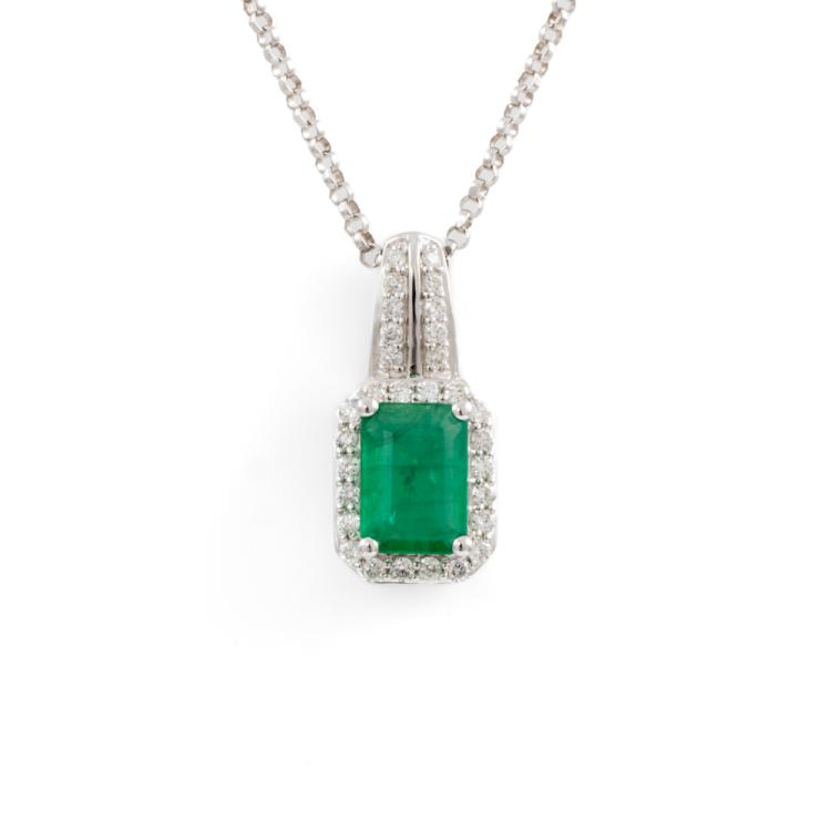 Pendant and earrings set. Emerald pendant with emerald cut natural Emeralds of 0.73ct and round natural Diamonds totalling 0.18cts, 18ct white gold with 45cm 18ct white gold chain. Emerald earrings with 2 emerald cut natural Emerald totalling 1.04cts and round natural Diamonds totalling 0.29cts, 18ct white gold. Total weight: 6.3g. With Valuation dated 28/10/13. (Pre-owned)