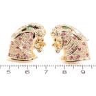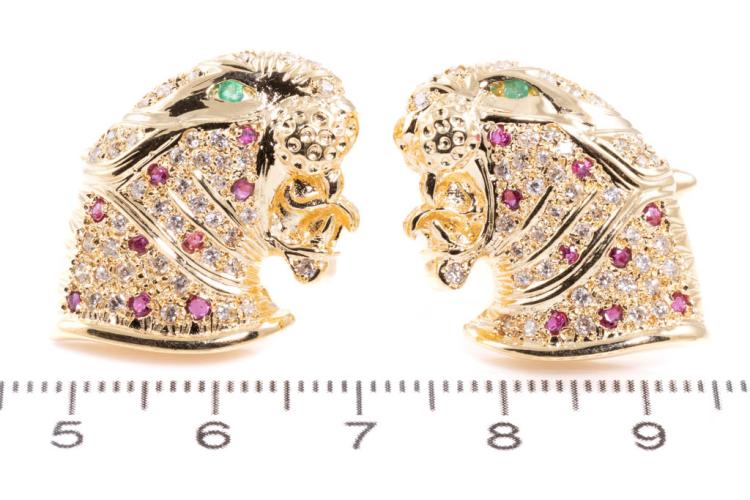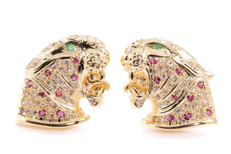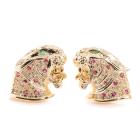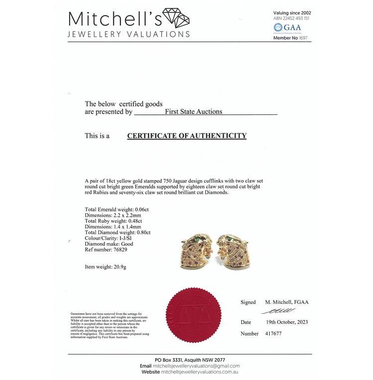 Jaguar design cufflinks with round Natural Emeralds totalling approximately 0.06ct, round natural Rubies totalling 0.48ct and round natural Diamonds totalling 0.80ct (Estimated grading: I-J SI). 18ct yellow gold. Weight: 20.9g. With certificate #417677. (Pre-owned)