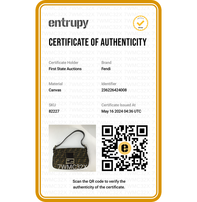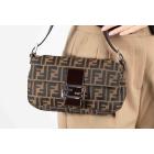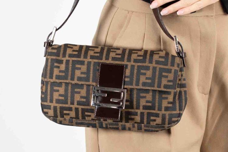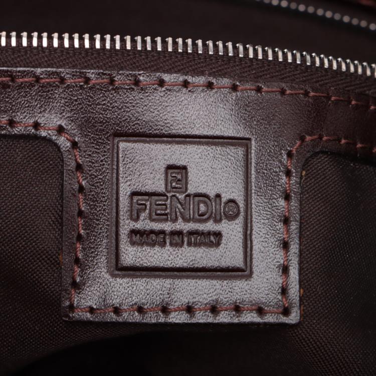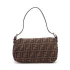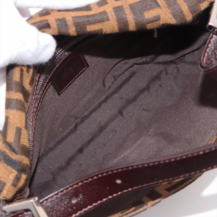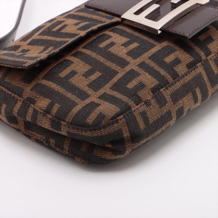Fendi Baguette shoulder bag in Zucca canvas in brown. Featuring a dark chocolate brown leather looping shoulder strap and facing flap with FF logo detail, silver tone hardware. The magnetic button closure opens to a brown fabric interior with a zipper pocket. Approximate dimensions: 25.5cm(L) x 14cm(H) x 4cm(D), 19cm handle drop. Accompanied by a Fendi dust bag. With Entrupy Certificate of Authenticity. (Pre-owned)