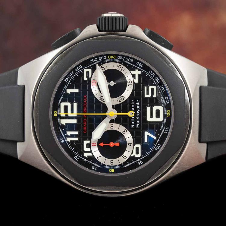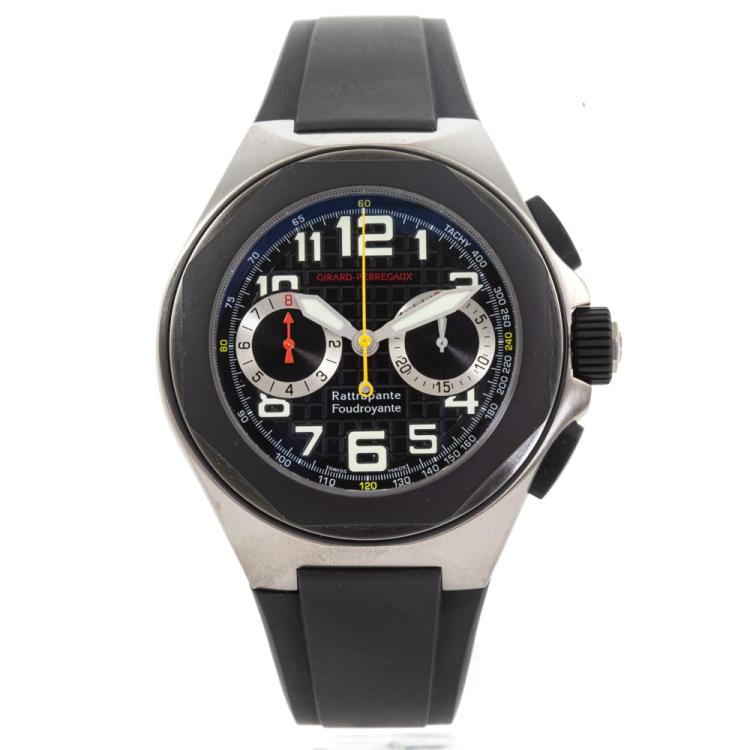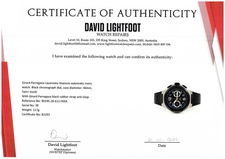 Girard Perregaux Lauereato titanium automatic mens watch. Black chronograph dial, case diameter: 46mm, wrist size: 21cm, Swiss made. Ref# 90195-28-611-FK6A. With Girard Perregaux black rubber strap and clasp. With Certificate of Authenticity, Undated Girard Perregaux International Warranty card and Girard Perregaux box. 3 month FSA warranty. (Pre-owned)