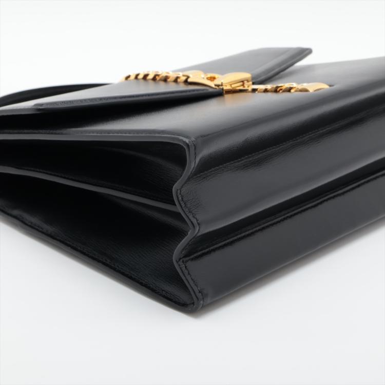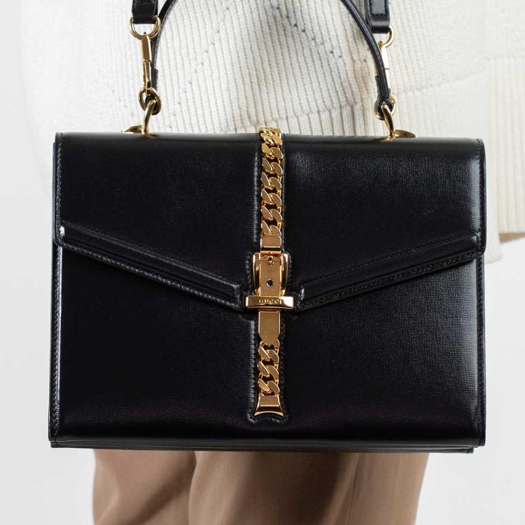 Gucci Sylvie 1969 2way bag in black leather. Featuring single top handle, gold-toned hardware, flap with web detail buckle closure on front. This opens to a grey leather lining interior with 2 compartments. Approximate dimensions: 26cm(W) x 19cm(H) x 9cm(D), 11cm handle height and 58cm shoulder height. Accompanied by a Gucci dust bag. With Entrupy Certificate of Authenticity. (Pre-owned)