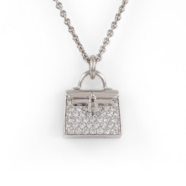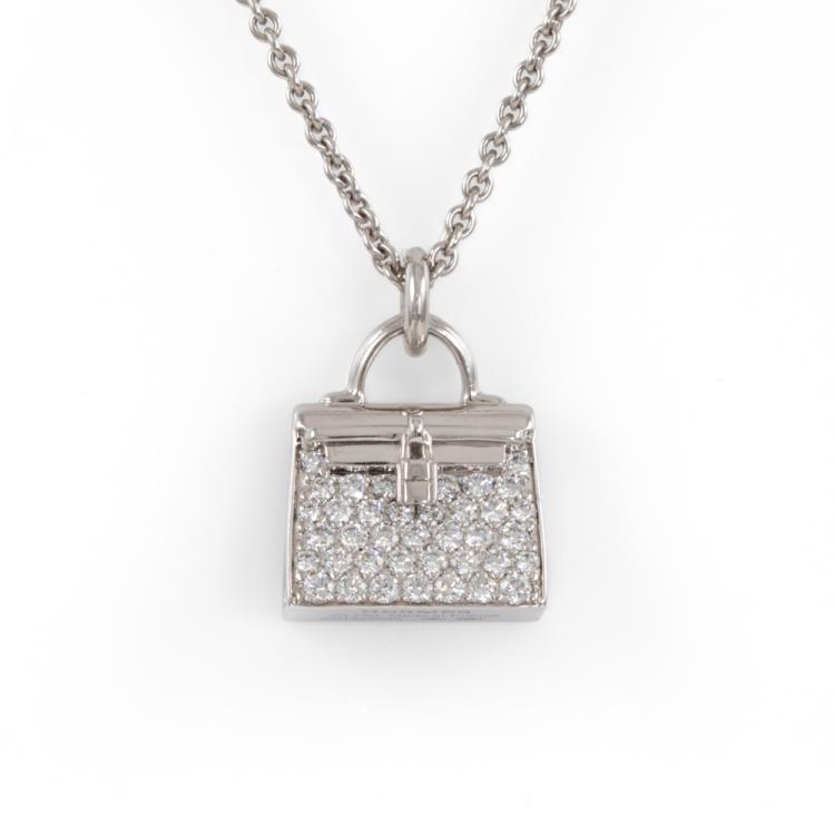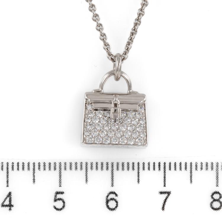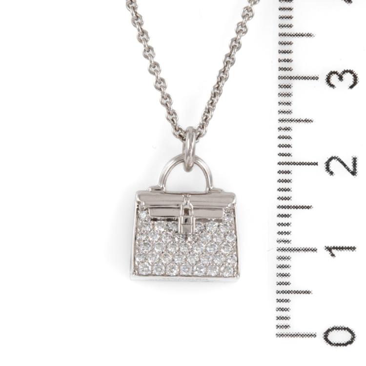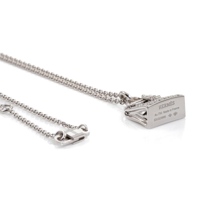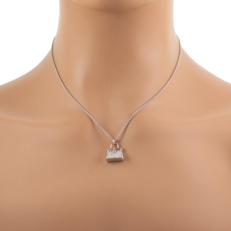 Hermes Amulettes Kelly pendant with 38 round Natural Diamonds totalling 0.39cts (Hermes grading: F-G VVS). Motif size: 1.49 x 1.25cm. Made in France. 18ct white gold with 40cm 18ct white gold chain. Weight: 12.4g. With Hermes Box and Hermes Diamonds and Precious Metals Certificate dated 27/10/23. (Pre-owned)