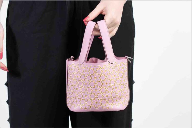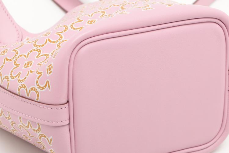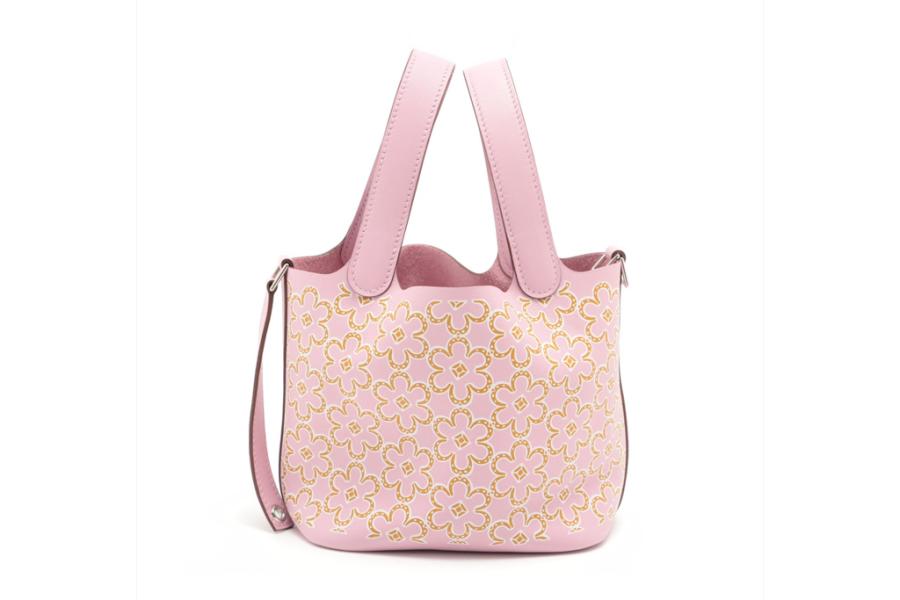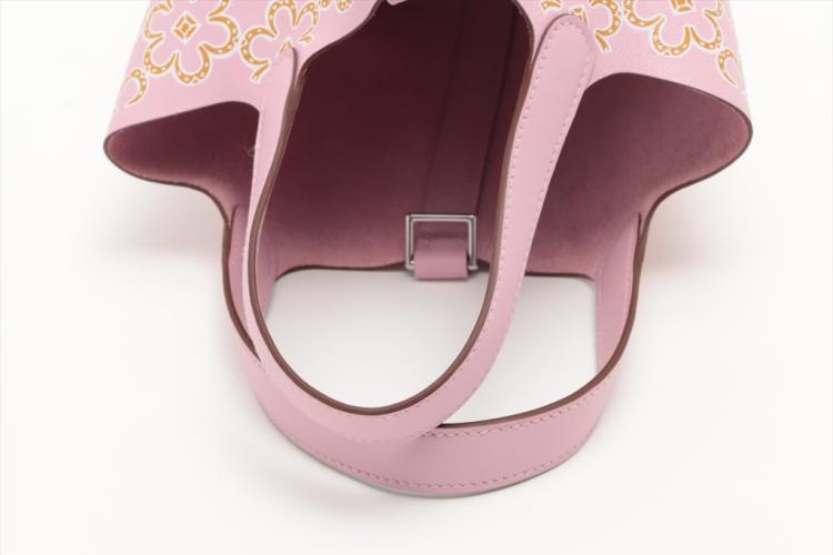 Hermès Micro Picotin bag in Mauve Sylvestre Swift leather with lucky daisy print (stamp U, 2022). Silver-toned hardware, open top, pink suede lining interior. Approximate dimensions: 12.5cm(L) x 12cm(H) x 9.5cm(D), 9cm handle drop. Accompanied by Hermes padlock, keys and dust bag. With Entrupy Certificate of Authenticity. (Pre-owned)
