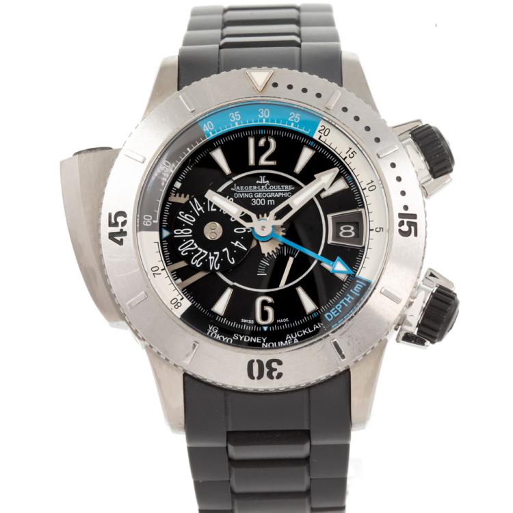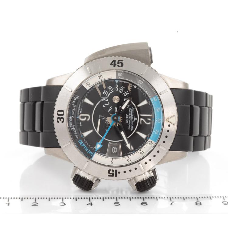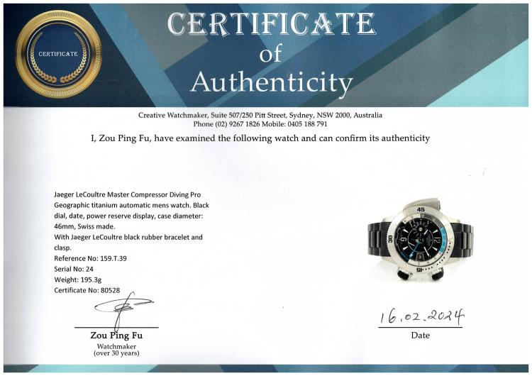 Jaeger LeCoultre Master Compressor Diving Pro Geographic titanium automatic mens watch. Black dial, date, power reserve display, case diameter: 46mm, wrist size: 20cm, Swiss made. Ref# 159.T.39. With Jaeger LeCoultre black rubber bracelet and clasp. With Certificate of Authenticity, Guarantee Certificate booklet dated 13/02/2014 and Jaeger-Le Coultre box. 3 month FSA warranty (Pre-owned)