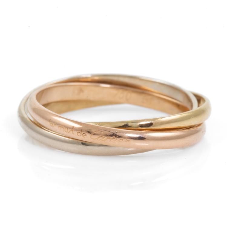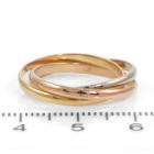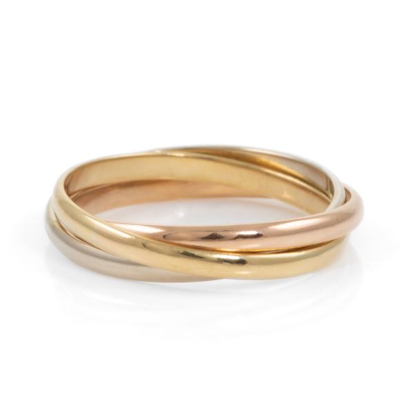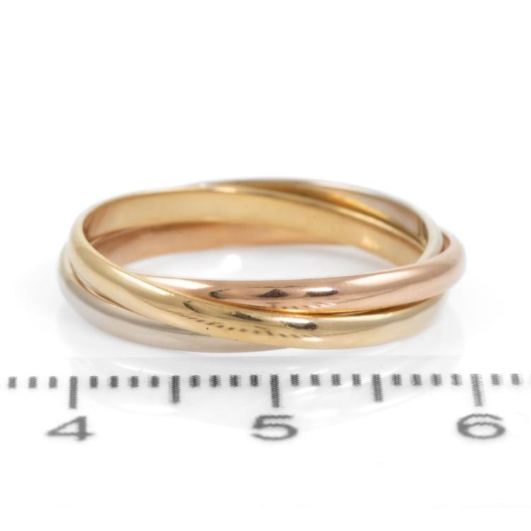 Le Must De Cartier trinity ring. Small model. 18ct yellow, rose & white gold. Cartier stamped size 51, actual ring size N½. Note: ring bands with resizing marks. Weight: 3.7g. Band width: 1.8mm & 1.9mm. With Cartier box. (Pre-owned)