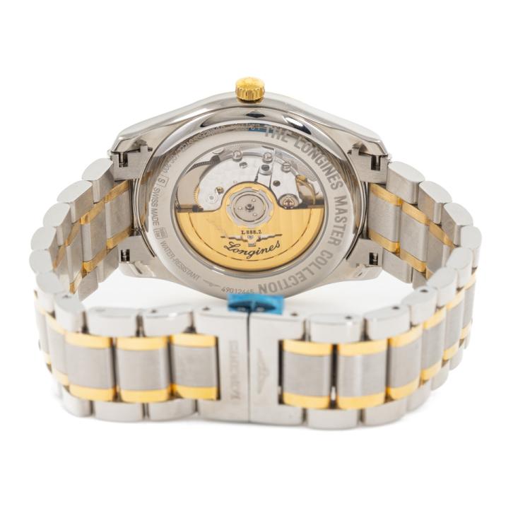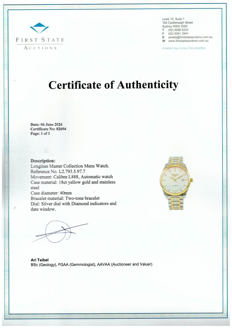 Longines Master Collection 18ct yellow gold and stainless steel automatic mens watch. Silver dial, Diamond indicators, date, case diameter: 40mm, wrist size: 19.5cm, Swiss made. Ref# L2.793.5.97.7. With Longines two-tone bracelet and clasp. With FSA Certificate of Authenticity, Longines Diamond Certificate card and Longines box. 3 month FSA warranty (As new, Note: minor scratches on case and bracelet due to being display stock)
