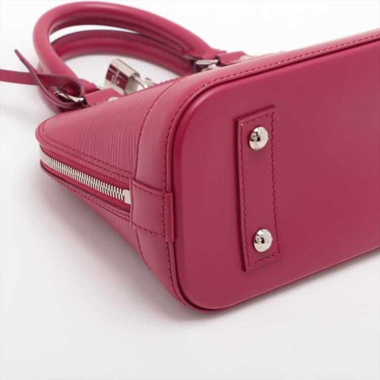 Louis Vuitton Alma BB bag in Burgundy Epi leather. Featuring smooth cowhide-leather trim, silver-toned hardware, dual rolled handles and double zip closure. The top opens to a matching colour microfiber lining interior with a patched pocket. Approximate dimensions: 24cm (L) x 16.5cm (H) x 11.5cm (D), 9cm handle drop and 56cm detachable strap drop. Accompanied by LV padlock, keys, crochet, dust bag & box. With Entrupy Certificate of Authenticity. (Pre-owned)