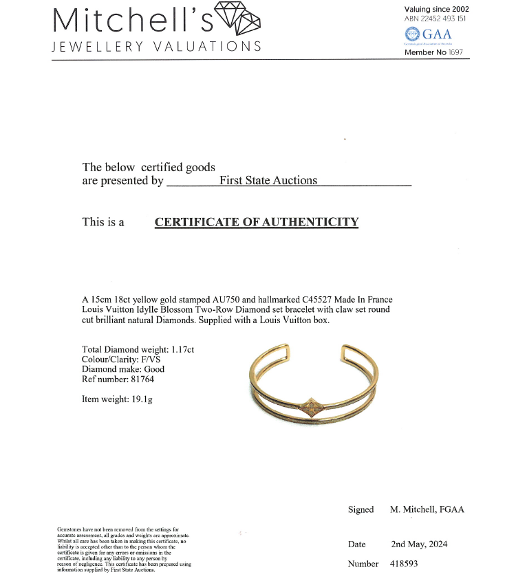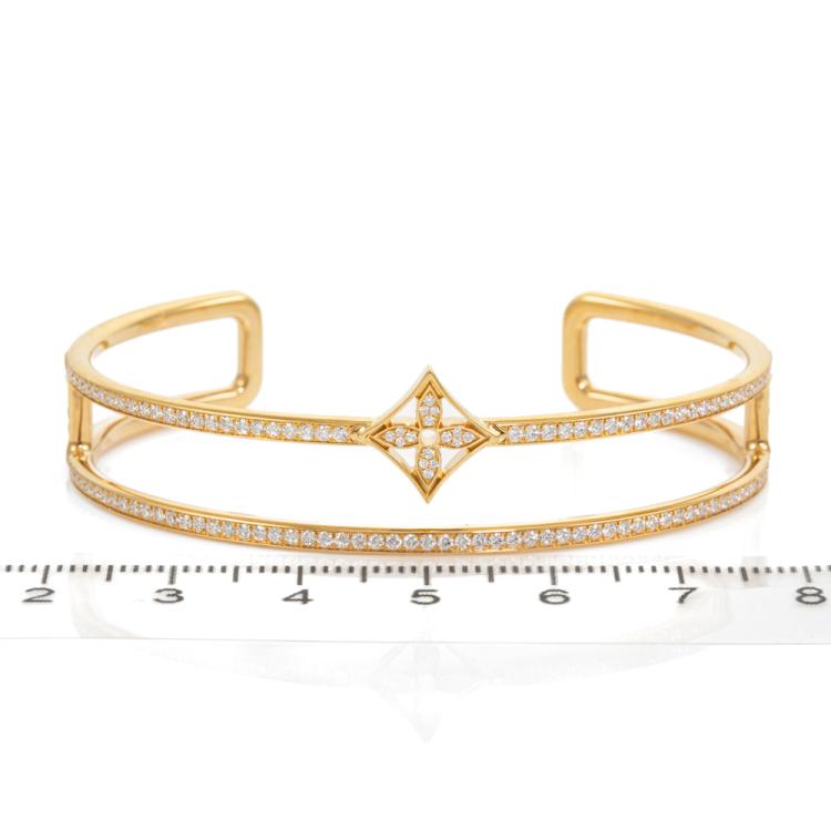 Louis Vuitton Idylle Blossom Two-Row Diamond bracelet with round natural Diamonds totalling approximately 1.17ct (Estimated grading: F VS). 18ct yellow gold. Stamped size: 15. Made in France. Weight: 19.1g. With Louis Vuitton box. With Certificate: 418593. (Pre-owned)
