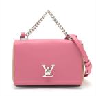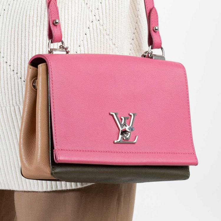 Louis Vuitton LockMe II BB in calfskin leather in pink, dark hunter green and beige. Featuring silver tone hardware, chain handle, snap buttons on sides, full flip-over flap with LV logo turned lock closure. It opens to a patch pocket and fabric lining interior. Approximate dimensions: 22cm(L) x 15,5cm(H) x 6.5cm(D), 9cm handle height and 54cm detachable and adjustable strap height. Accompanied by a LV dust bag. With Entrupy Certificate of Authenticity. (Pre-owned)