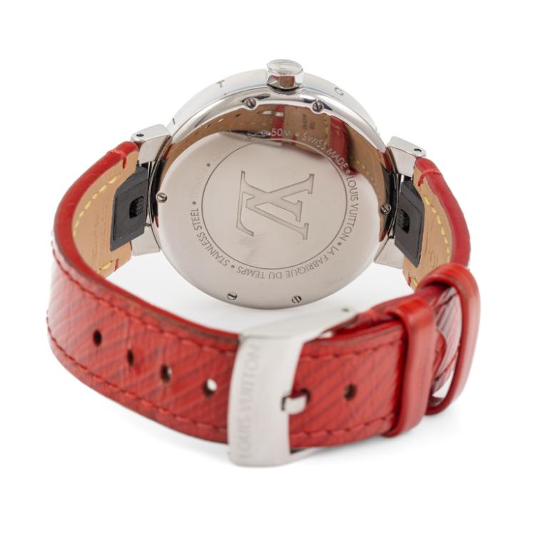 Louis Vuitton Tambour Moon Divine stainless steel ladies quartz watch. Mother of Pearl Dial, Diamond indicators, case diameter: 35mm, strap length: 18cm, Swiss made. Ref# QA019. With Louis Vuitton red leather strap and clasp. With Certificate of Authenticity, Louis Vuitton International Guarantee booklet dated 27/05/2018 and Louis Vuitton box. 3 month FSA warranty. (Pre-owned)