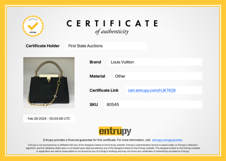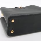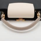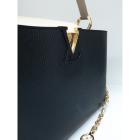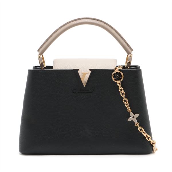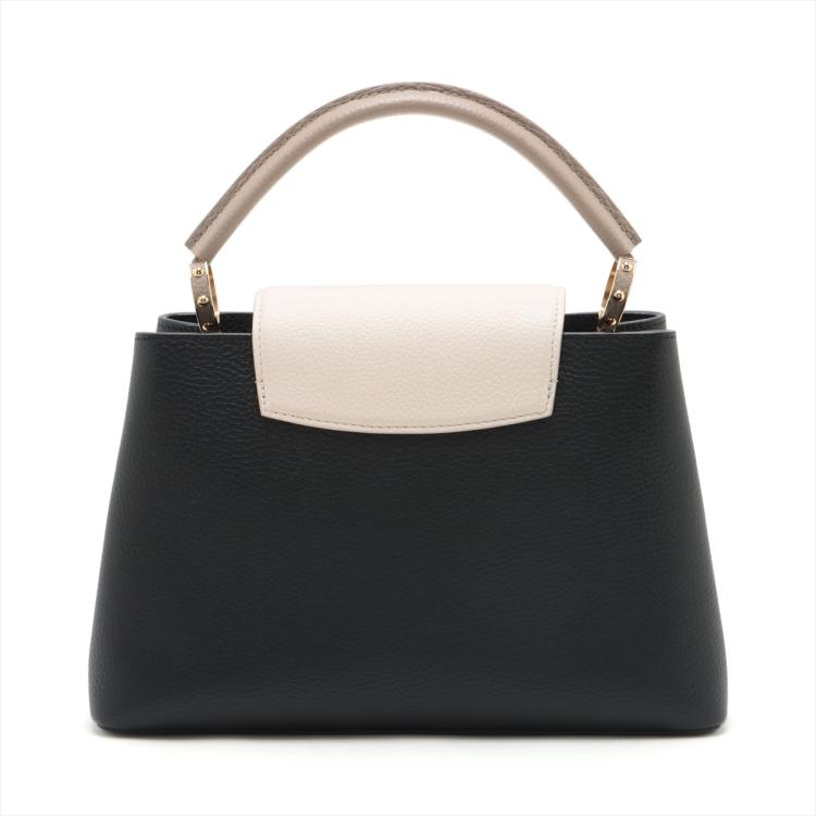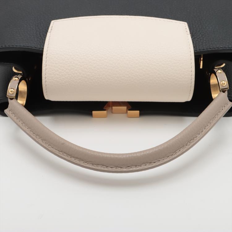 Louis Vuitton Capucines MM in black & beige leather. Featuring gold-toned hardware, single top grey leather handle, flap with a snap-hook closure. This opens to a black leather lining, compartmented interior with a zipped pocket. Approximate dimensions: 31cm(Base-L) x 19.5cm(H) x 10.5cm(D), 11cm handle drop. (Shoulder strap NOT included). Accompanied a LV decoration chain and a dust bag. With Entrupy Certificate of Authenticity. (Pre-owned)