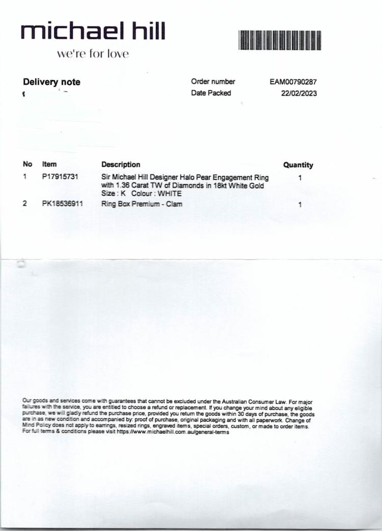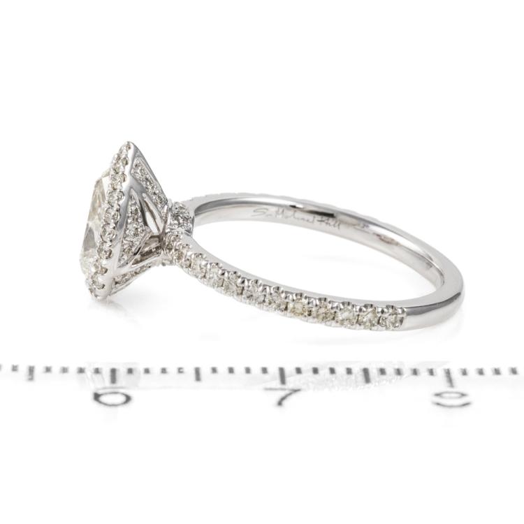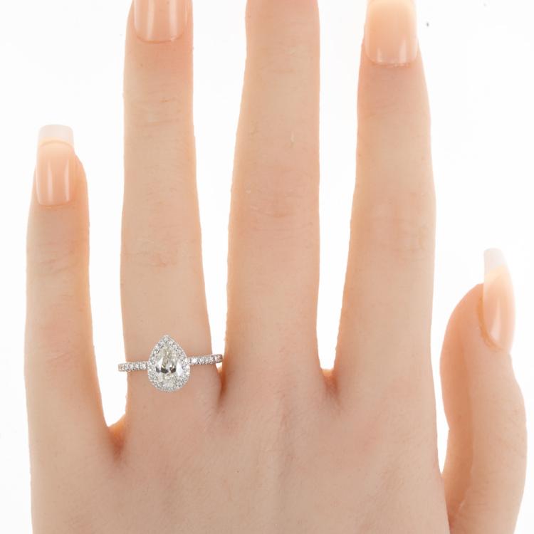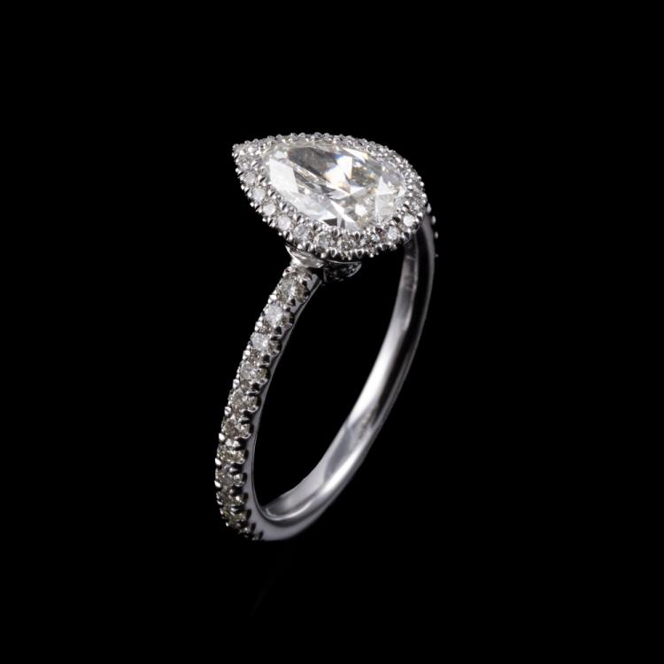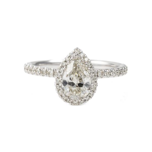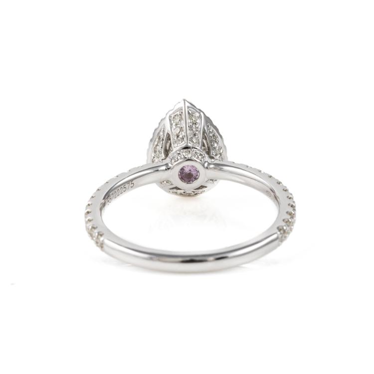 Michael Hill Diamond halo ring with centre pear shape Natural Diamond of 0.90ct (with IGI Diamond report graded as H SI2 #557222575) and rest round Natural Diamonds totalling 0.49cts (Estimated grading: I-K SI2) and ring bridge set with a single pink Natural Sapphire of approximately 0.15ct (under centre Diamond). 18ct white gold. Ring size K. Band width: 1.8mm. Weight: 3.0g. (Pre-owned)