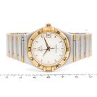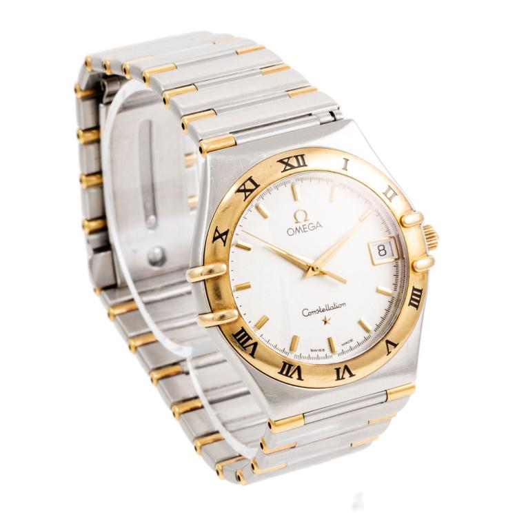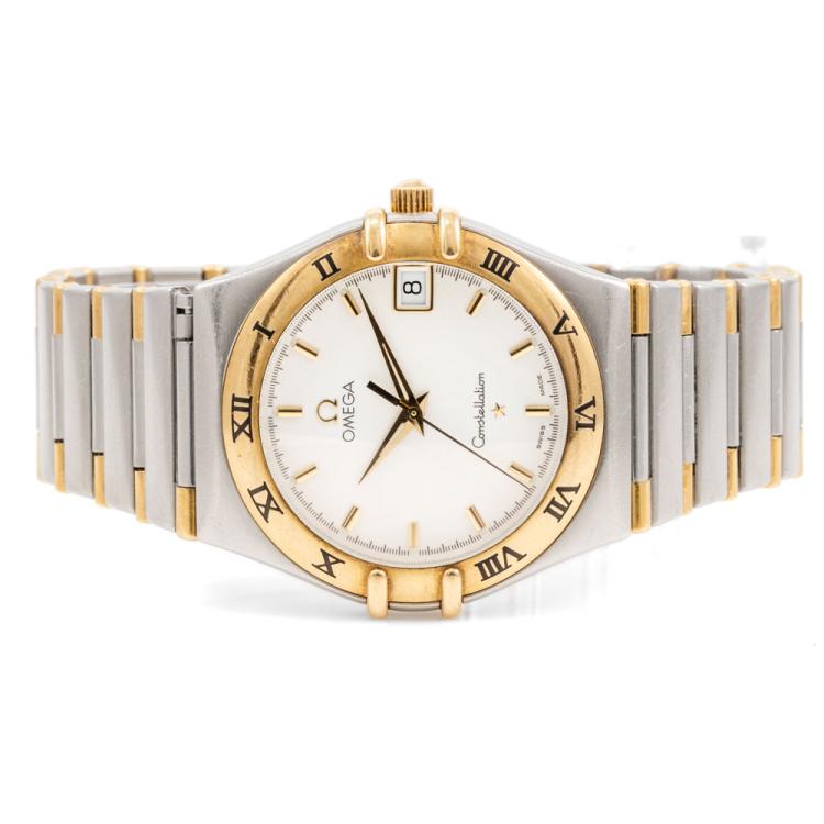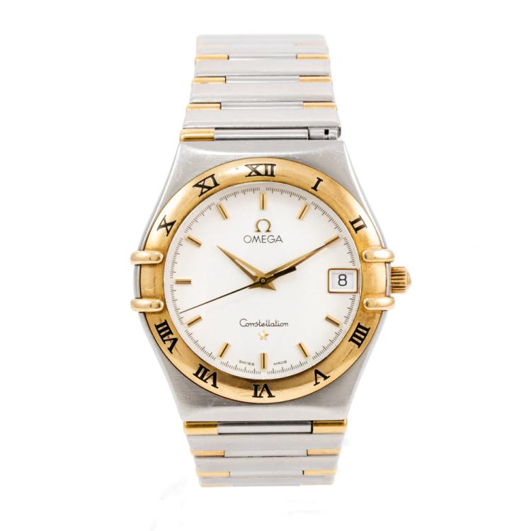 Omega Constellation 18ct yellow gold and stainless steel quartz ladies watch. White dial, date, case diameter: 34mm, wrist size: 17.5cm, Swiss made. Ref# 396.1201. With Omega two-tone bracelet and clasp. With Certificate of Authenticity. 3 month FSA warranty (Pre-owned)