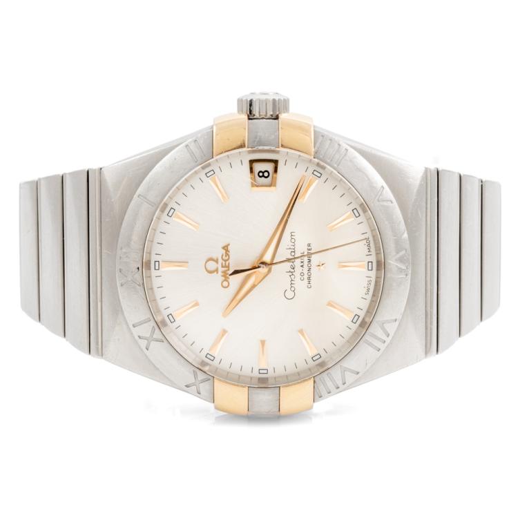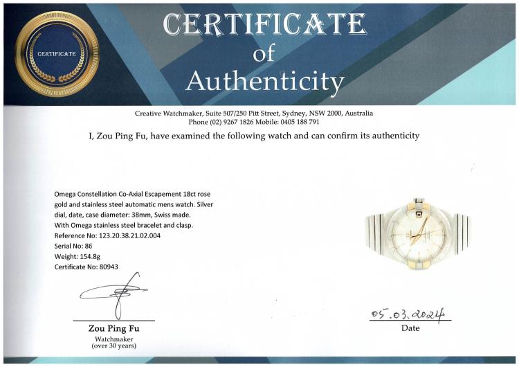 Omega Constellation Co-Axial Escapement 18ct rose gold and stainless steel automatic mens watch. Silver dial, date, case diameter: 38mm, wrist size: 17cm, Swiss made. Ref# 123.20.38.21.02.004. With Omega stainless steel bracelet and clasp. With Certificate of Authenticity. 3 month FSA warranty (Pre-owed)