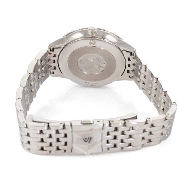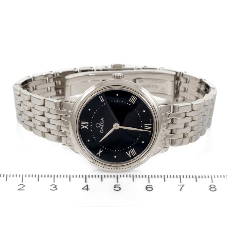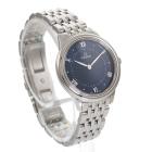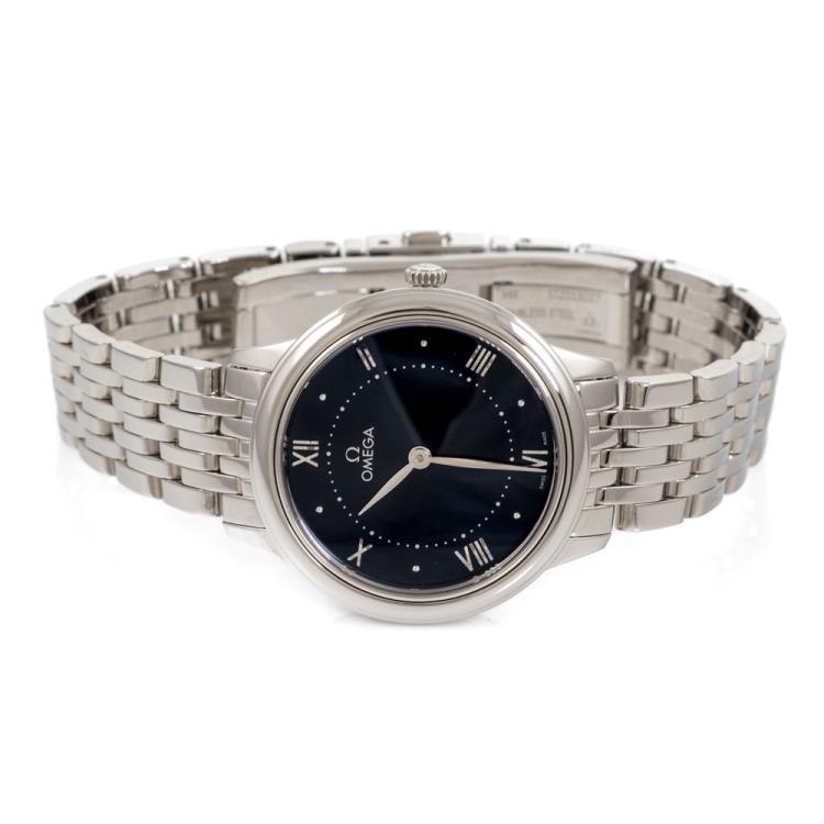 Omega De Ville Prestige stainless steel quartz ladies watch. Blue dial, case diameter: 30mm, wrist size: 15.5cm, Swiss made. Ref# 434.10.30.60.03.001. With Omega stainless steel bracelet and clasp. With Unstamped Omega International Warranty card, Omega Pictograms card and Omega box. 3 month FSA warranty (As new, Note: minor scuff on case and bracelet due to being display stock)