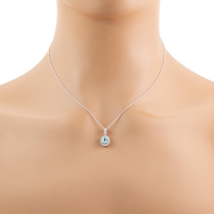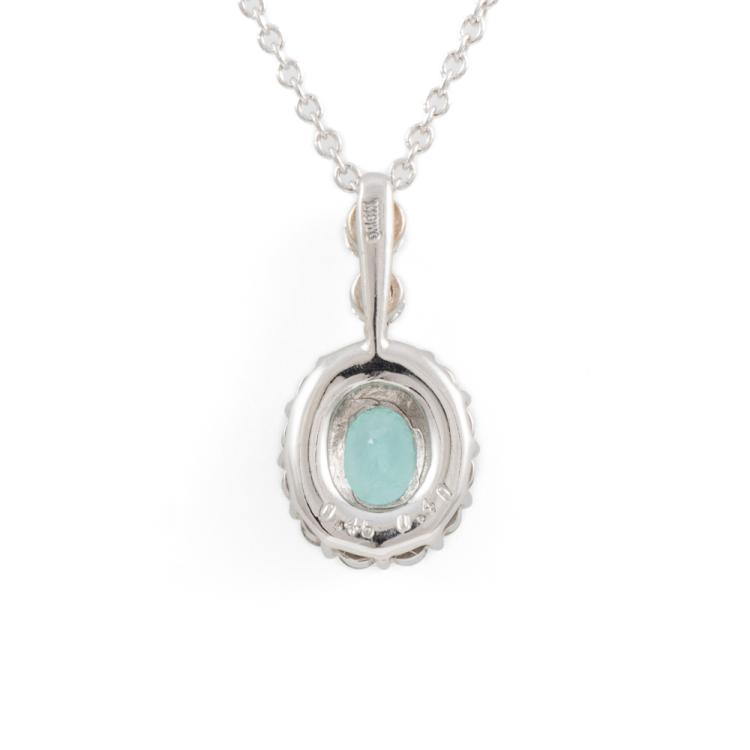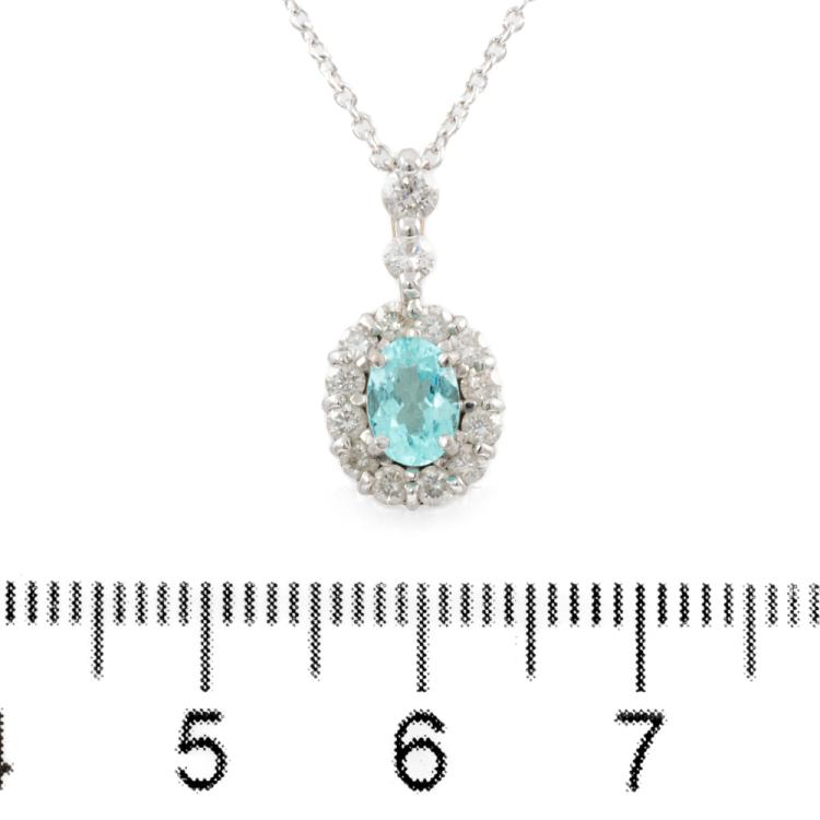 Tourmaline and Diamond pendant with oval shape Natural Paraiba Tourmaline of 0.45ct and natural Diamonds totalling 0.40cts (Estimated grading: G-H SI). 18ct white gold with 14ct white gold 40.0cm chain. Weight: 2.7g. (Pre-owned)