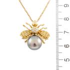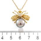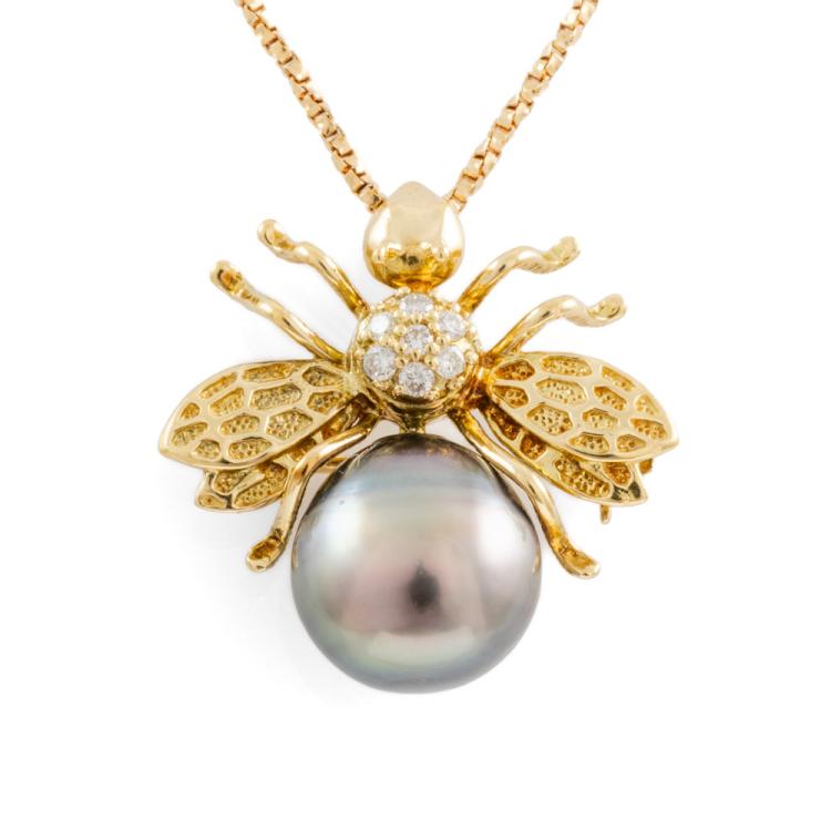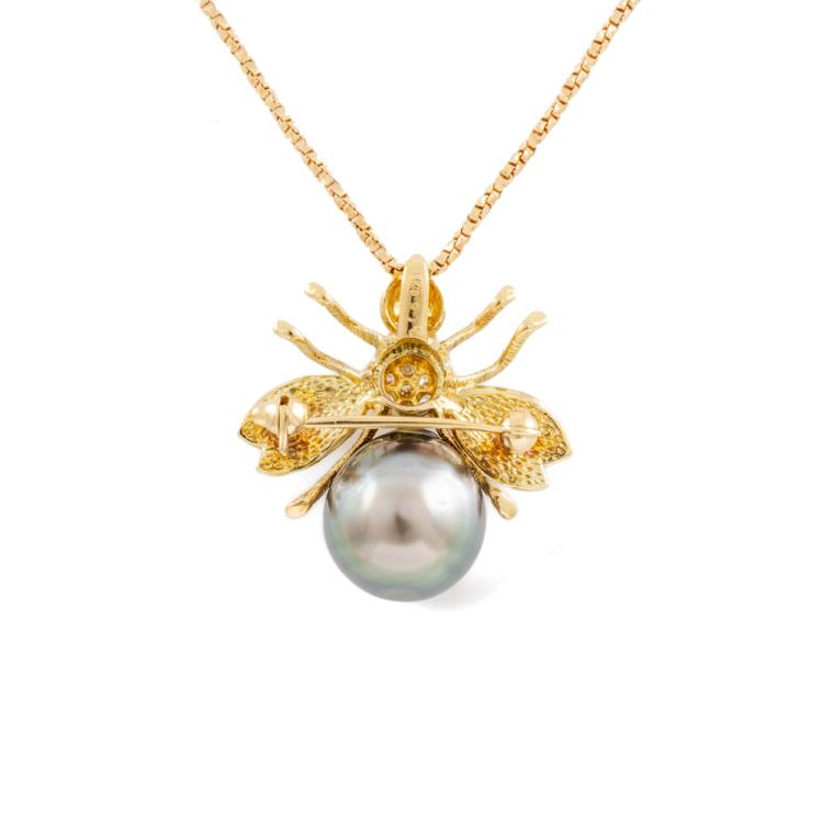 Pearl and Diamond bumblebee pendant/brooch with a Tahitian Pearl of 10.0mm and round natural Diamonds totalling 0.10cts. 18ct yellow gold with 18ct yellow gold chain. Adjustable Length: 37.0 - max 40.0cm. Weight: 7.7g. (Pre-owned)