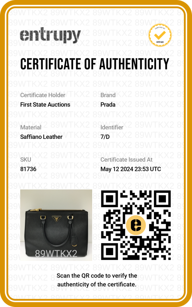 Prada large Galleria double zip bag in black Saffiano leather. Featuring two zipped compartments, gold-toned hardware, snap closures on the sides. The top opens to a centre logo-print nylon lining interior with patch pockets. Approximate dimensions: 32cm(W) x 24cm(H) x 13cm(D), 13cm handle drop and 53cm adjustable strap drop. Accompanied by leather crochet, Prada certificate card (dated 25/04/18) and dust bag. With Entrupy Certificate of Authenticity. (Pre-owned)