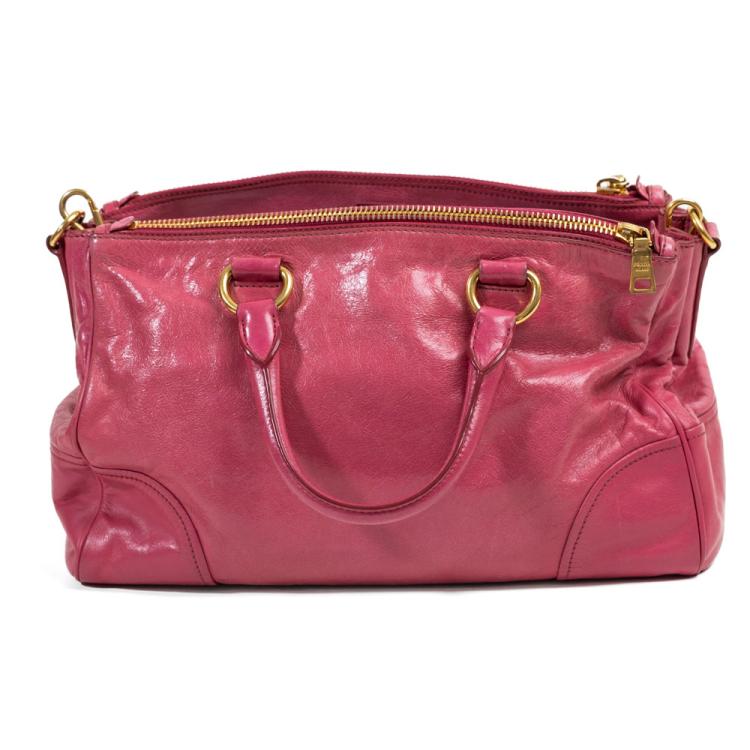 Prada 2way bag in pink Vitello shine soft leather. Featuring top rolled handles, gold toned hardware, metal logo at front, dual zipped exterior pockets. The snap button closure opens to a logo jacquard pink nylon lining interior with zipped and patch pockets. Approximate dimensions: 36cm(W) x 22cm(H) x 13cm(D), 12cm handle drop and 55cm adjustable strap drop height. Accompanied by a luggage name tag. With Entrupy Certificate of Authenticity. (Pre-owned)