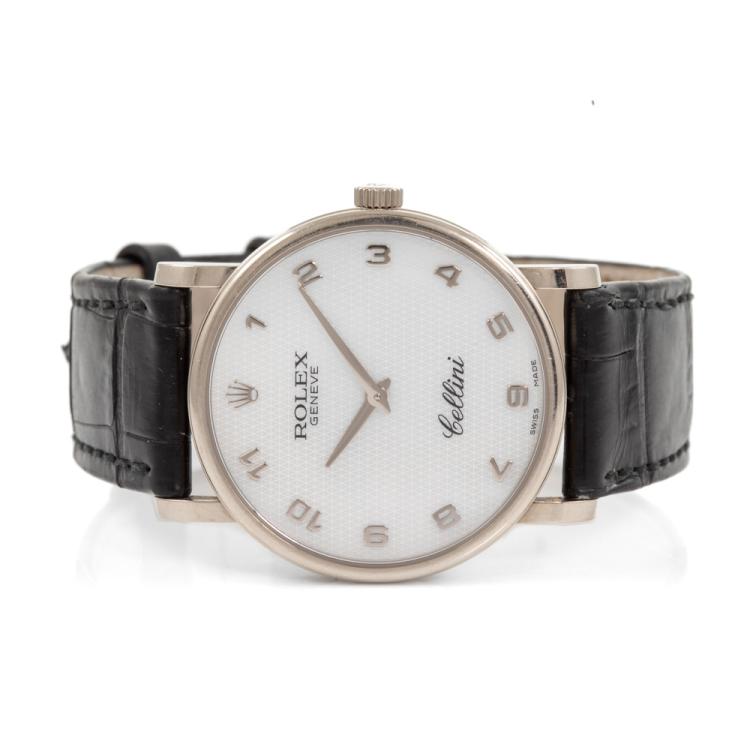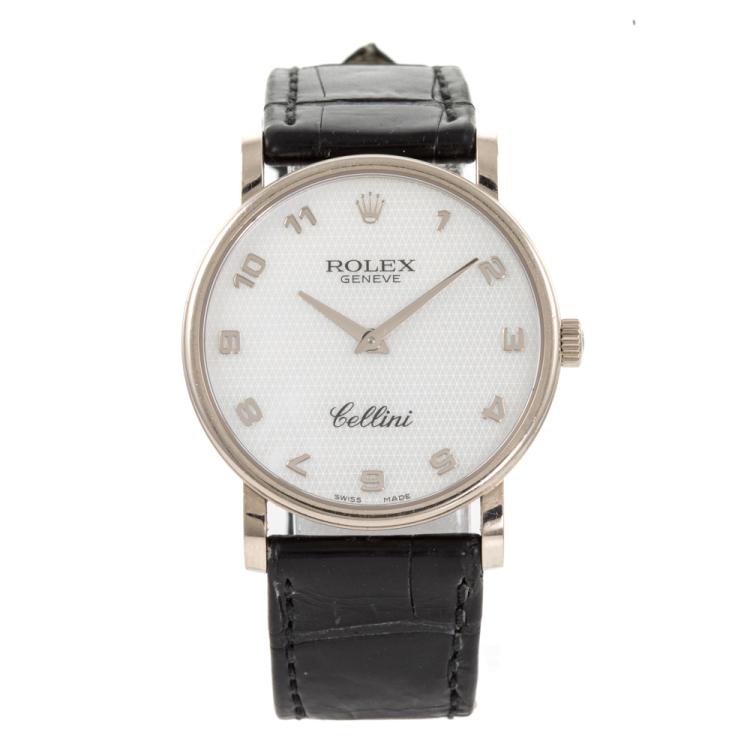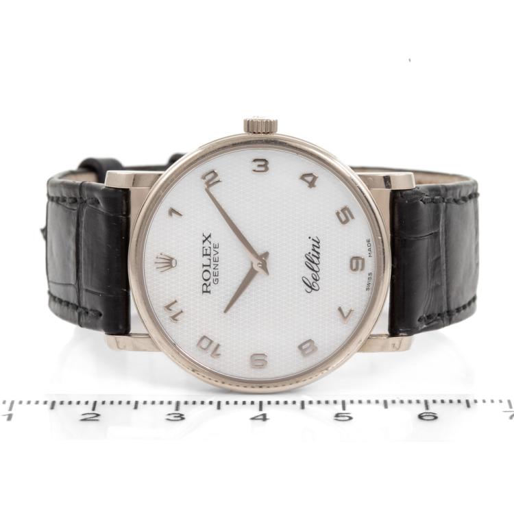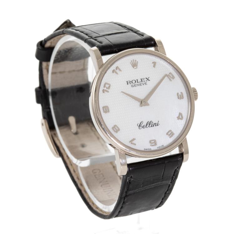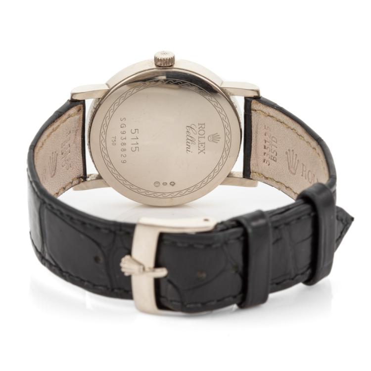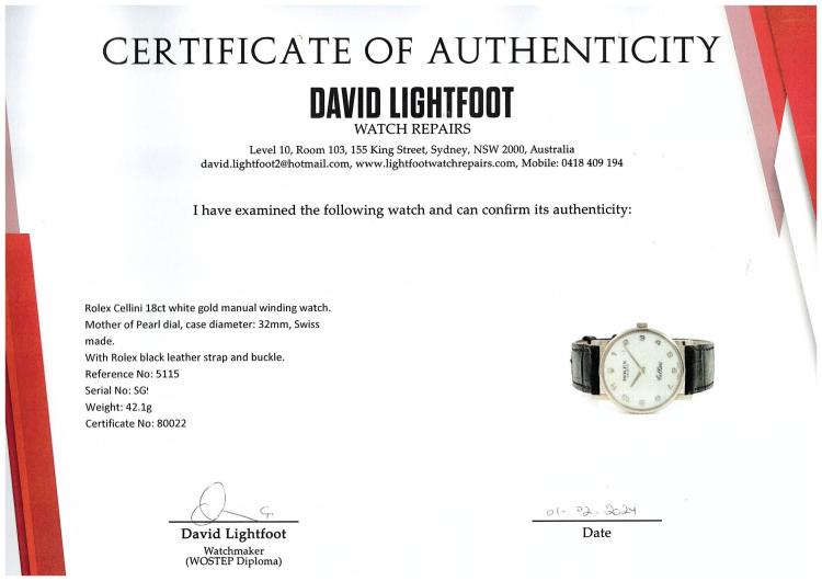 Rolex Cellini 18ct white gold manual winding watch. Mother of Pearl dial, case diameter: 32mm, strap length: 19.5cm, Swiss made. Ref# 5115. Circa: 1994. With Rolex black leather strap and buckle. With Certificate of Authenticity and Rolex box. 3 month FSA warranty (Pre-owned)