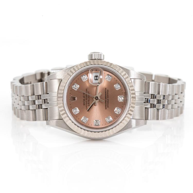 Rolex Oyster Perpetual Datejust 18ct white gold and stainless steel ladies automatic watch. Light brown dial, Diamond indicators, date, case diameter: 26mm, wrist size: 15cm, Swiss made. Ref# 179174G, Circa: 2000. With Rolex stainless steel Jubilee bracelet and clasp. With Certificate of Authenticity and Rolex box. 3 month FSA warranty. (Pre-owned)